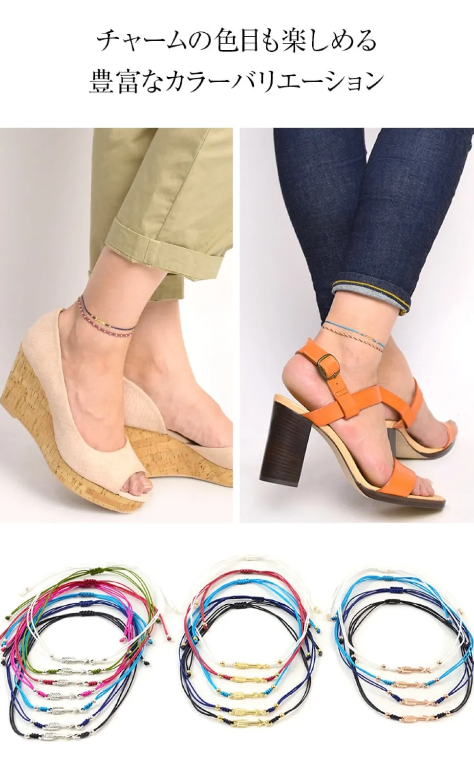 The anklet is available in 3 different colours of charms and 7 different colours of notching cords. With three charms and seven notched cords, there are a total of 16 colour combinations to choose from. It can be worn alone or stacked, depending on your mood, purpose and location.