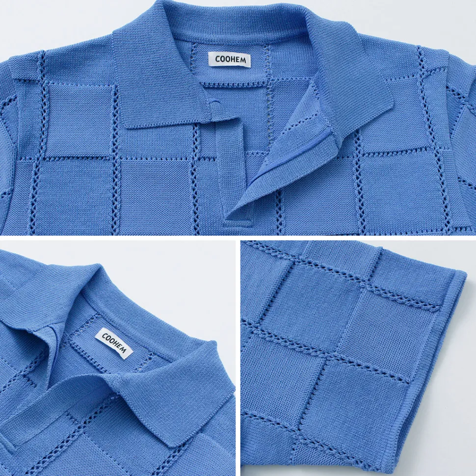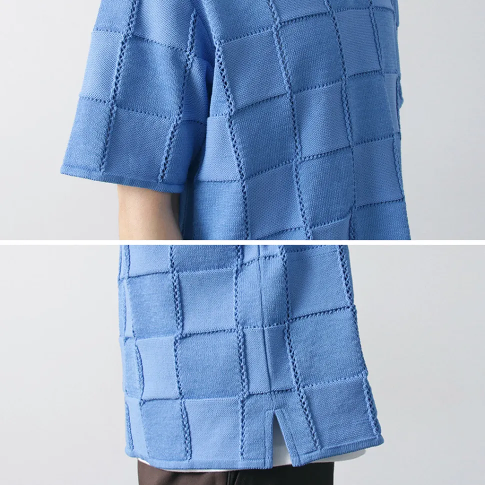 COOHEM introduces a short-sleeved summer knit with a block check pattern using a knitting technique known as “links knitting,” in which the front and back knits are repeated alternately.