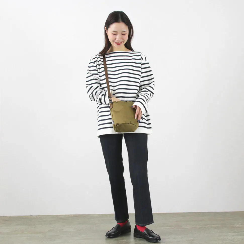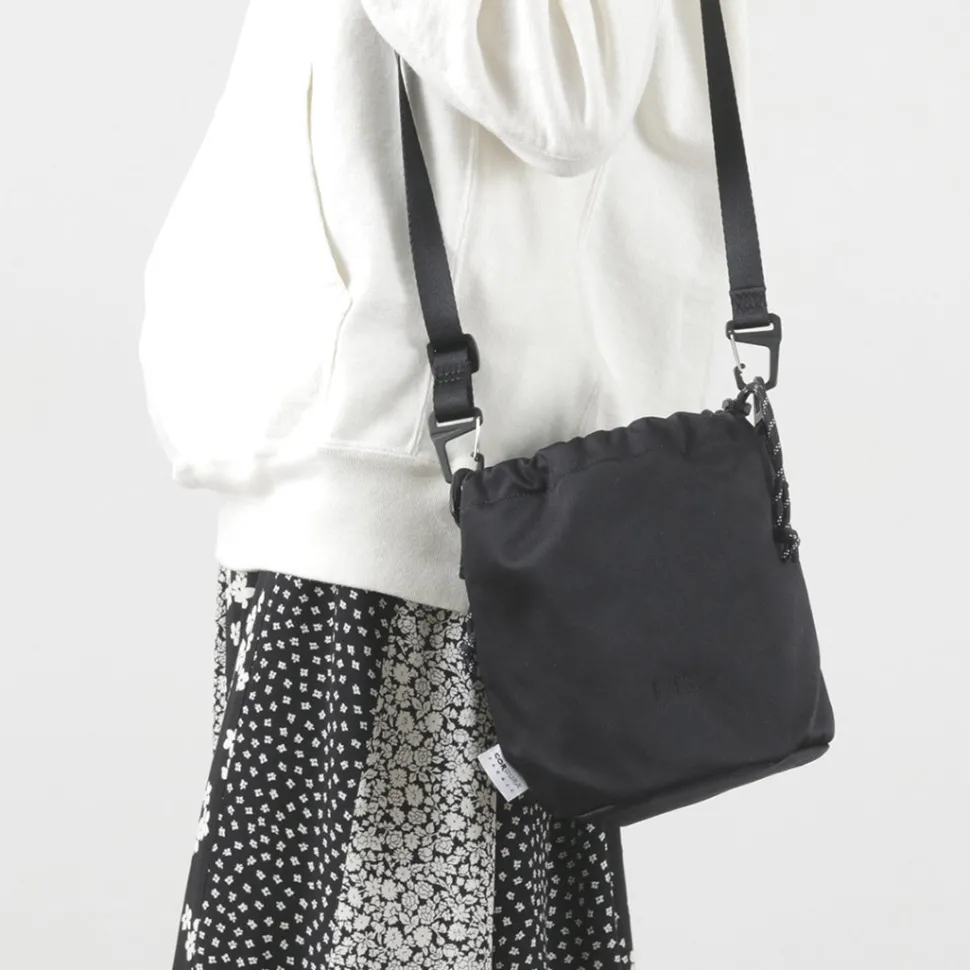 This drawstring shoulder bag is inspired by the chalk bags used for climbing and bouldering. The fabric is the world’s first “Cordura nylon satin,” which was developed in collaboration with INVISTA. This fabric is highly durable, yet has an elegant satin texture. The compact size is perfect for a quick trip to the shops, a festival, or a trip to a destination.