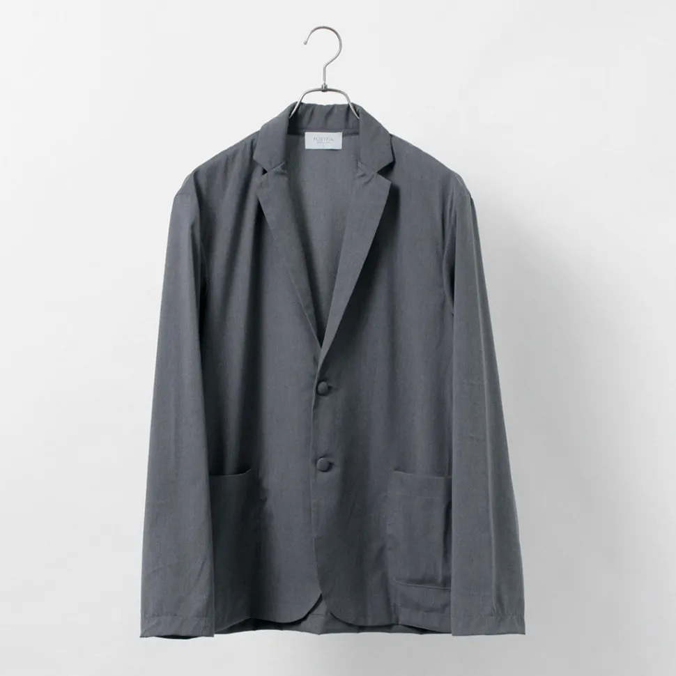 The fabric is densely woven with polyester and rayon yarns. This lightweight jacket with a smooth, powdery touch can be worn coolly even during hot and humid weather. The matte and subdued colors also give it an elegant and mature impression.