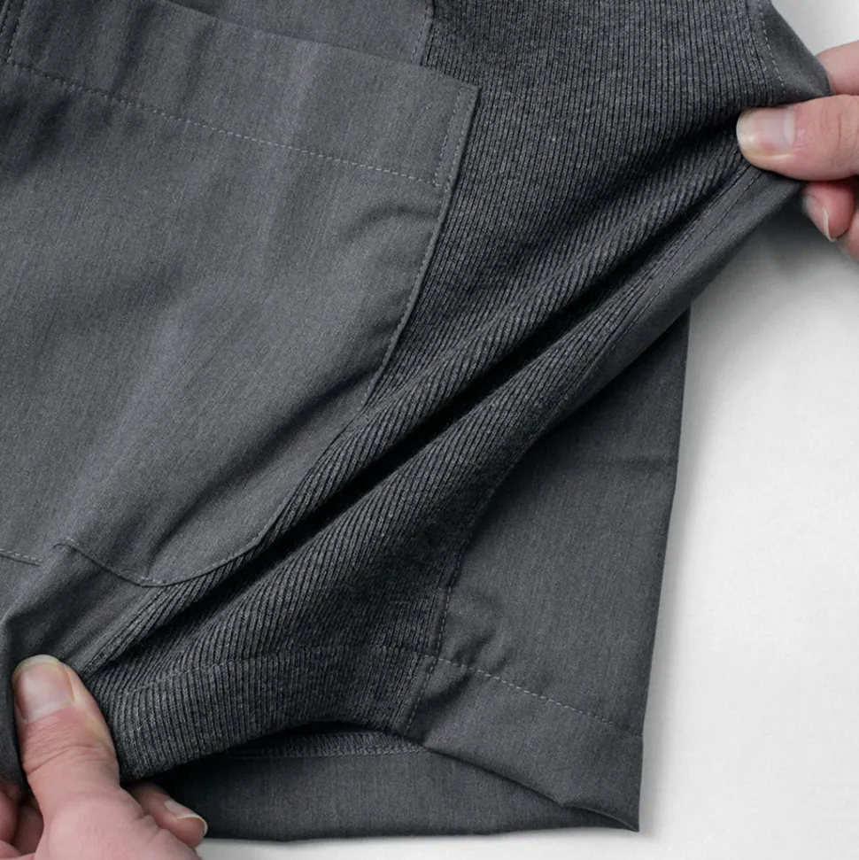 The most distinctive feature is the ribbed side part. When worn with pants, the ribbed line connects from the cuff to the hem of the pants in a straight line.