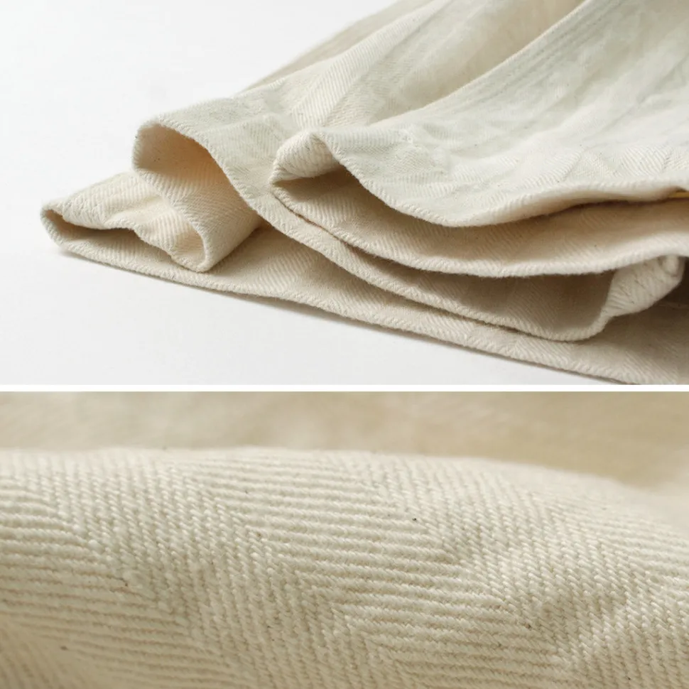They use a herringbone fabric developed jointly with a fabric manufacturer, using “WAVY MAGIC” yarns in the warp. The fabric features a unique, bold herringbone pattern with deep valleys and raised twill, along with a rough, natural feel. Additionally, the fabric’s appearance will change over time as you wear it, adding to its charm.