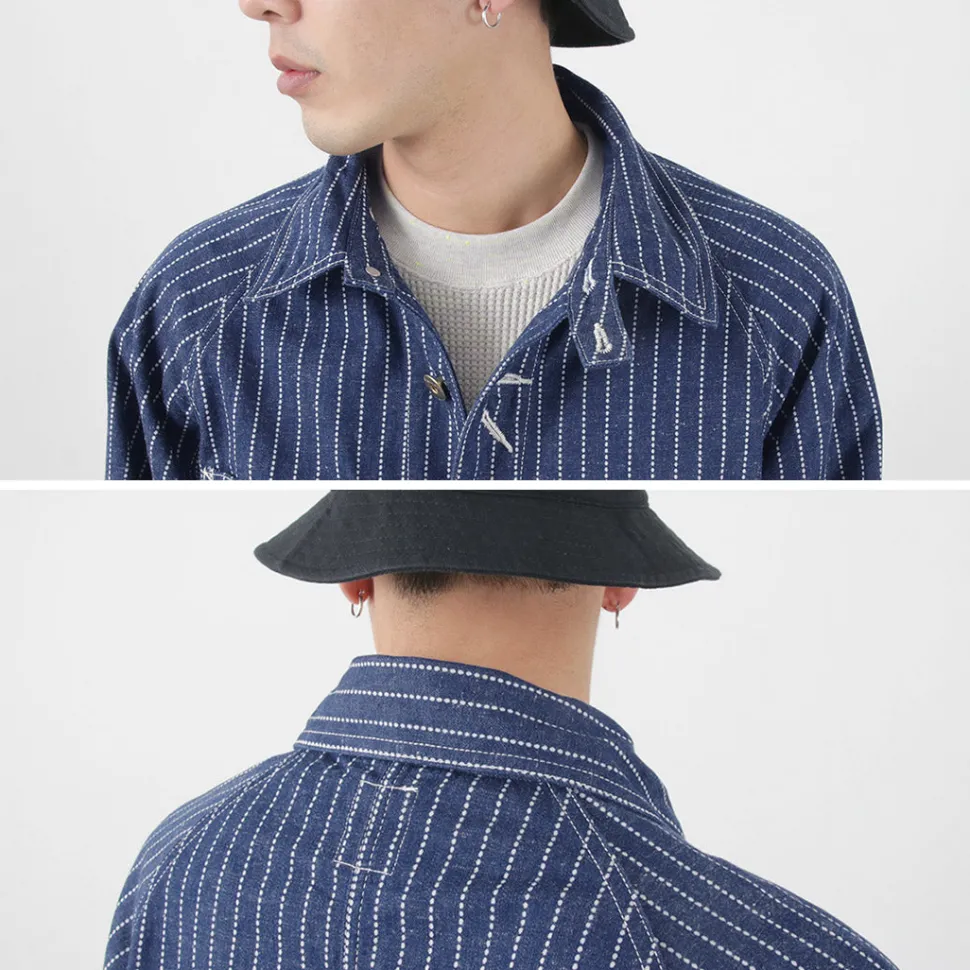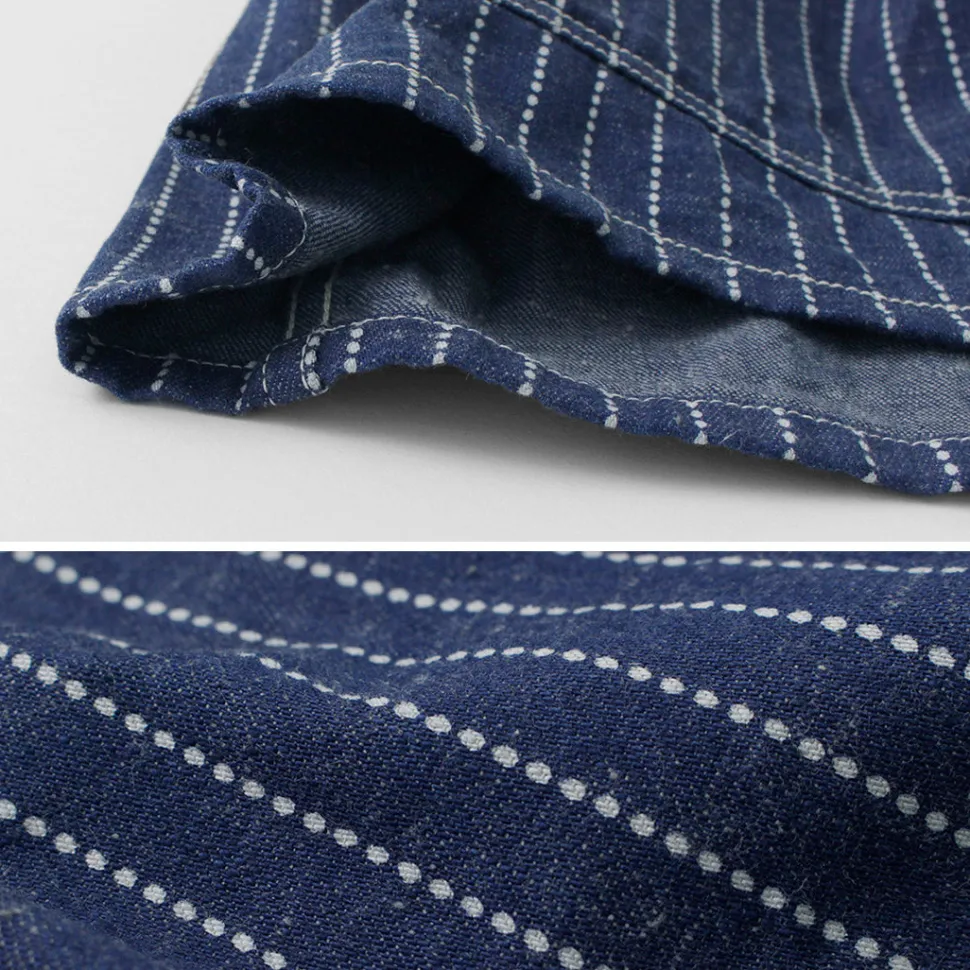 It is made of denim fabric with wabash stripes in a particular blue color. It has a good thickness that is easy to use in spring, and its crisp feel against the skin is also attractive.