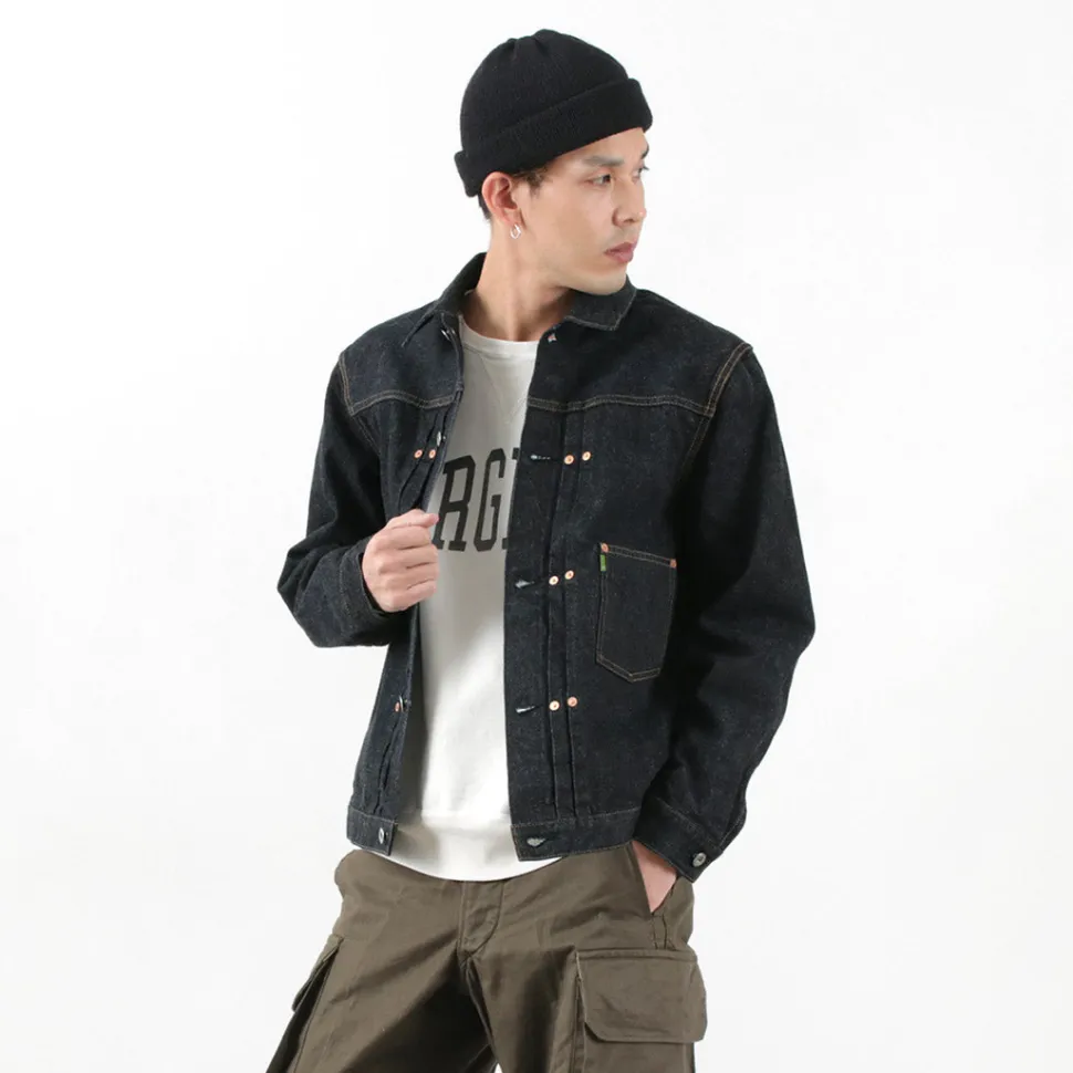 “Garage Denim Jacket” using 14.75oz (oz) original selvage denim from “FOB FACTORY”. The use of rivets for the pleats is a distinctive feature. The size of the jacket is slightly larger than the original, and it is comfortable to wear without a tight fit. It is a one-wash type of garment that allows you to enjoy the changes and bites over time with little worry of shrinkage after washing.