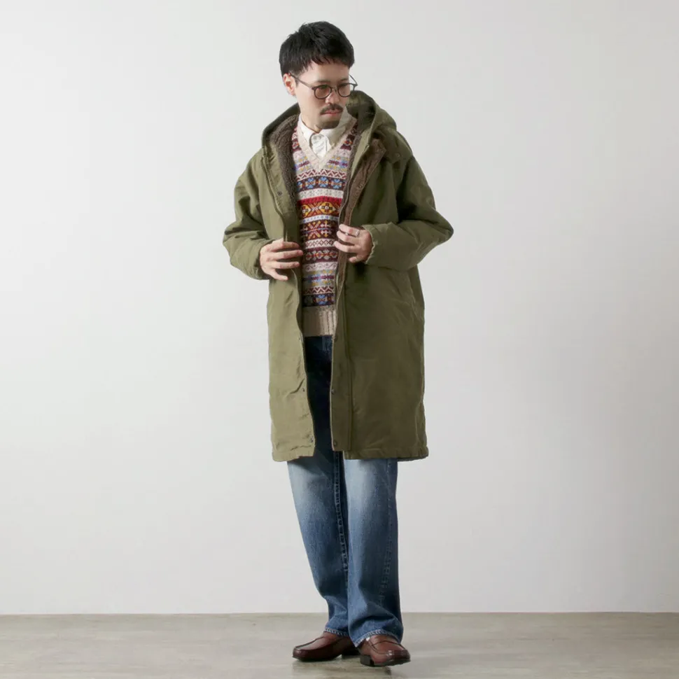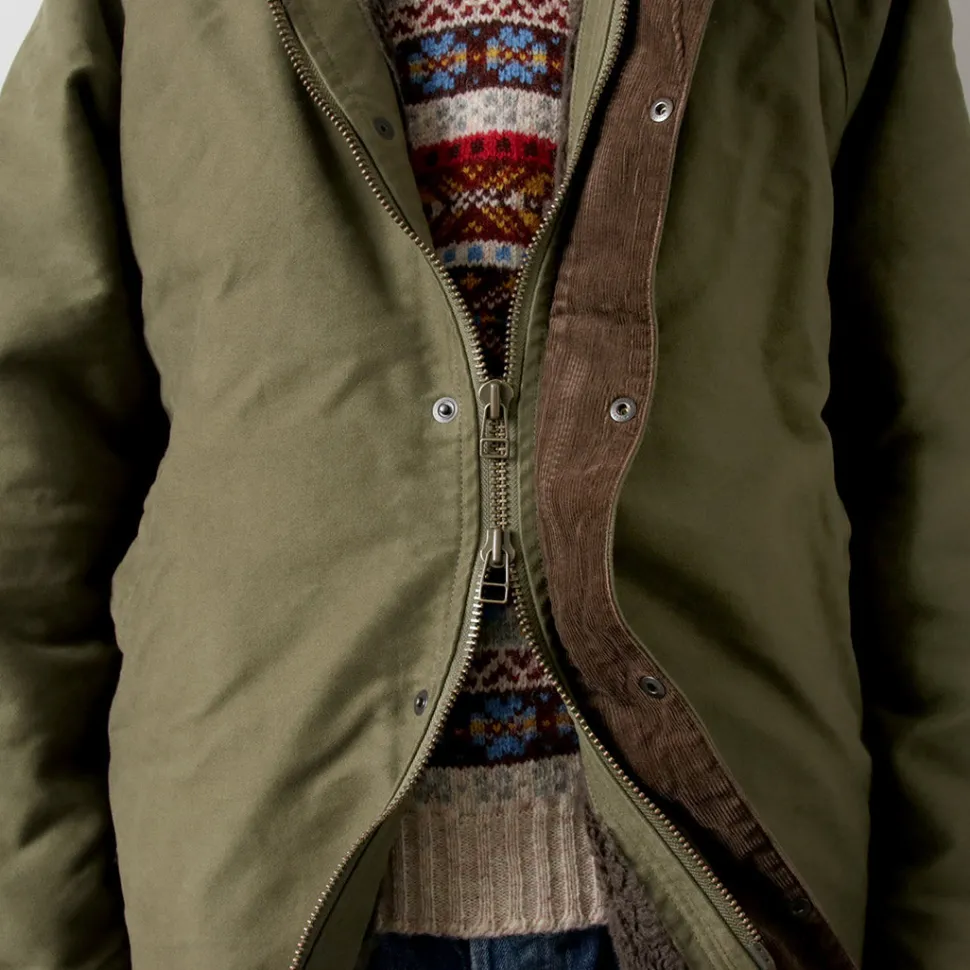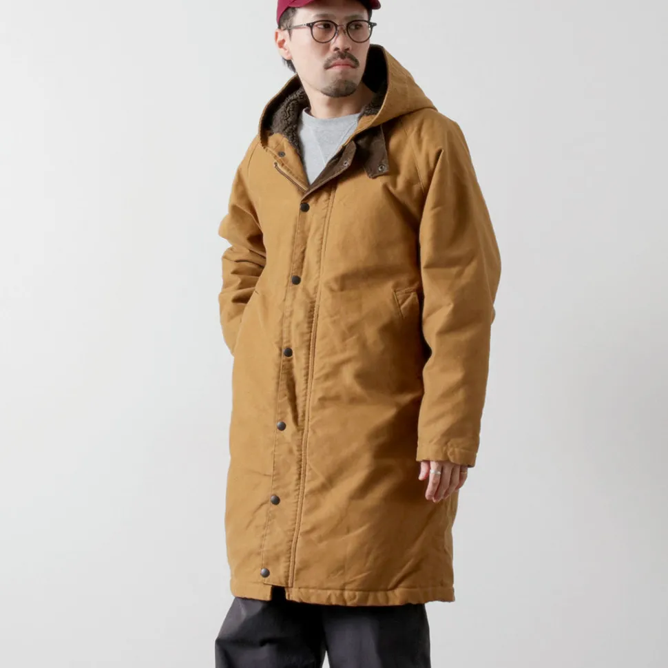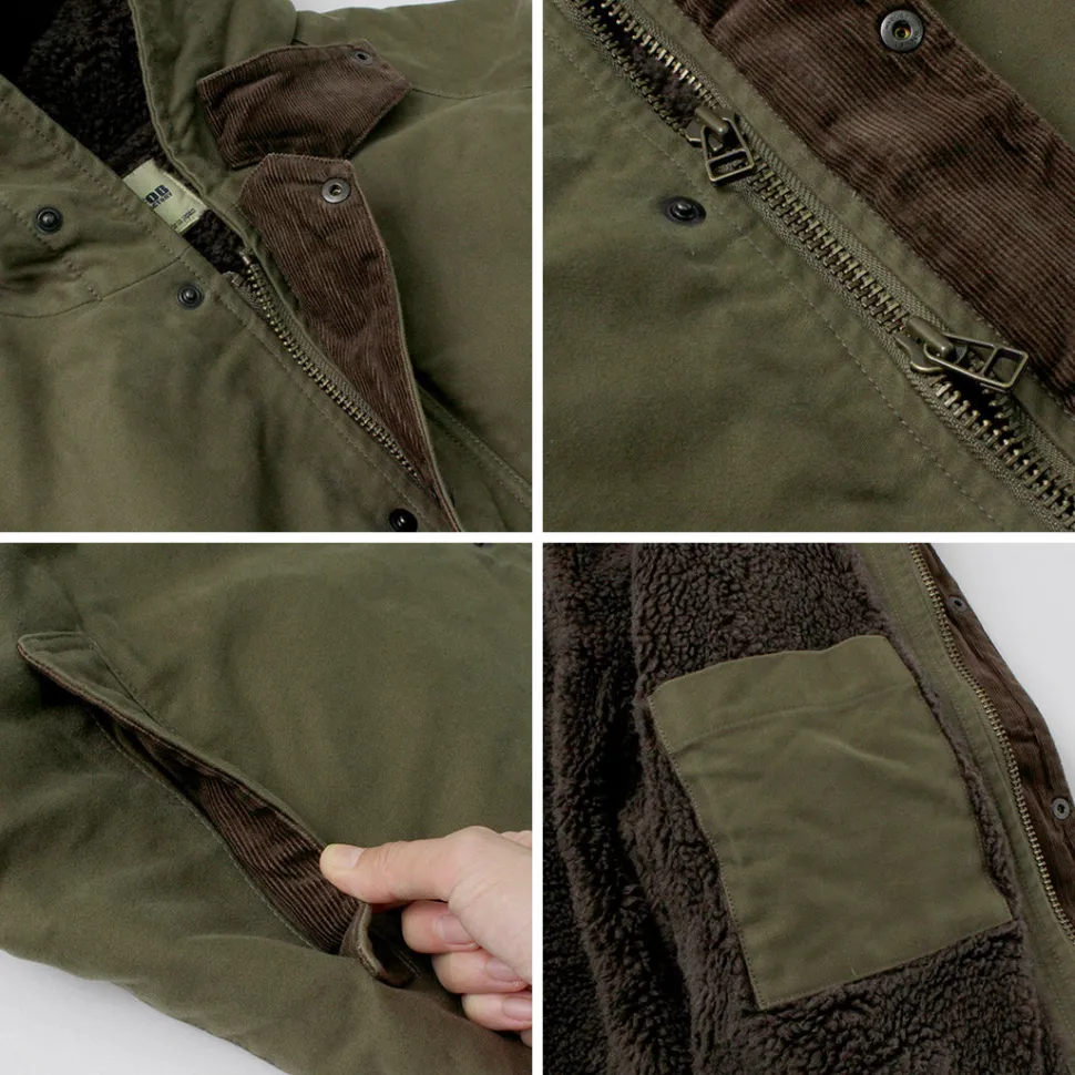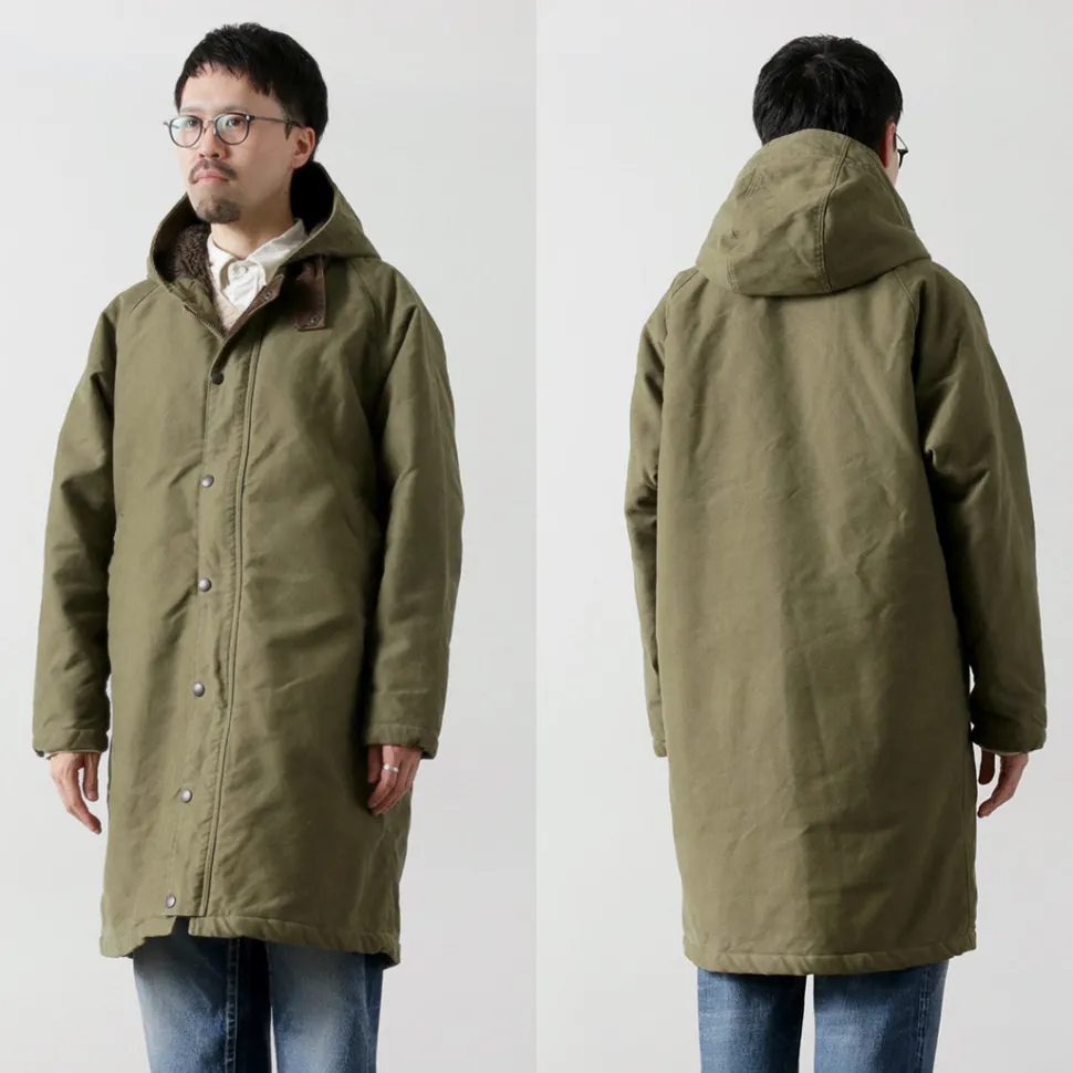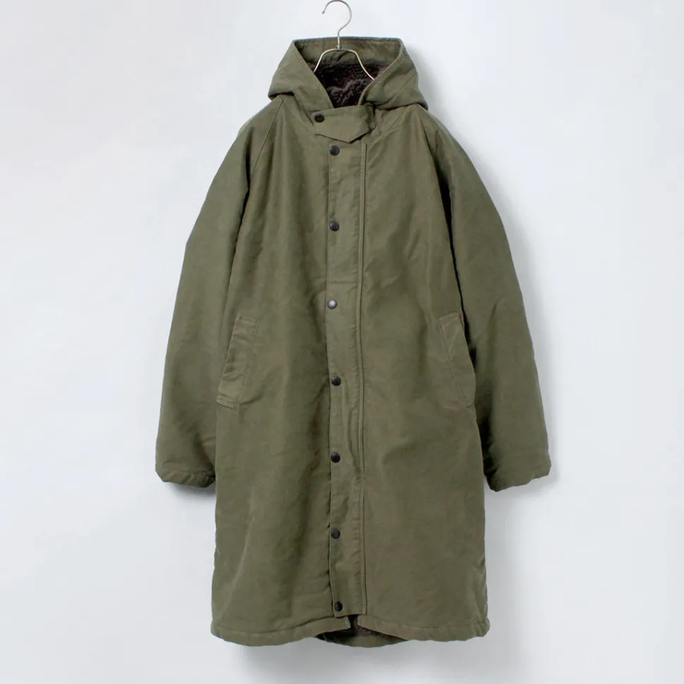 This hooded coat is made of moleskin, a material synonymous with FOB. The heavy fabric is lined with a thick boa lining for enhanced protection against the cold.