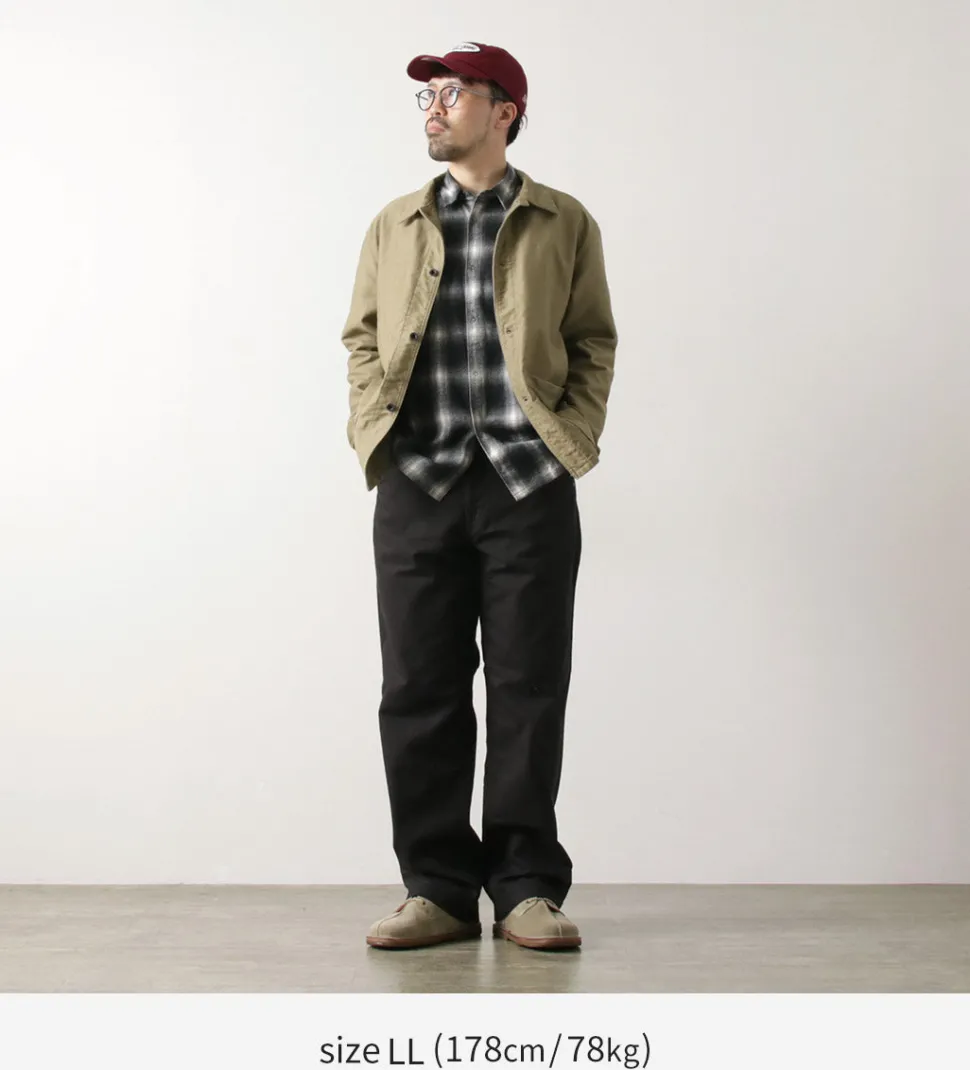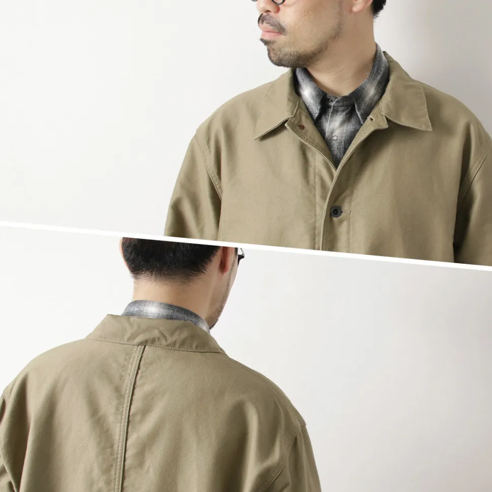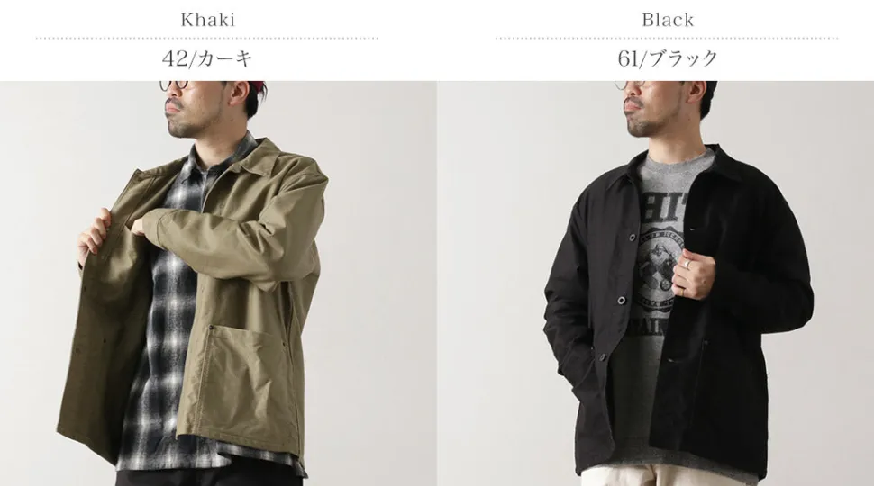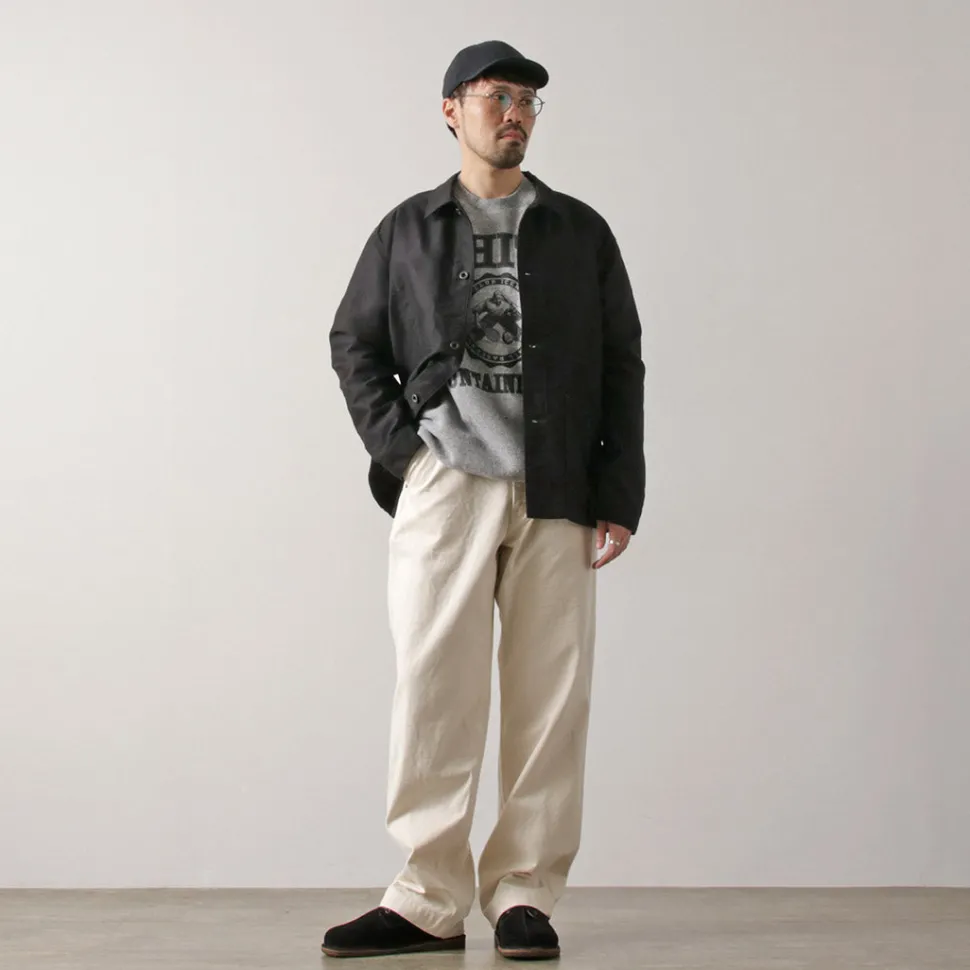 This jacket features a recreated cord cloth used in the so-called “N-1 DECK JACKET” issued to U.S. Navy soldiers from the 1940s to the 1950s. The fabric is characterized by its slightly stiff texture and rugged appearance. It is woven densely and thickly using threads of varying thickness in the warp and weft, resulting in a fabric that excels in durability, wind resistance, and warmth.