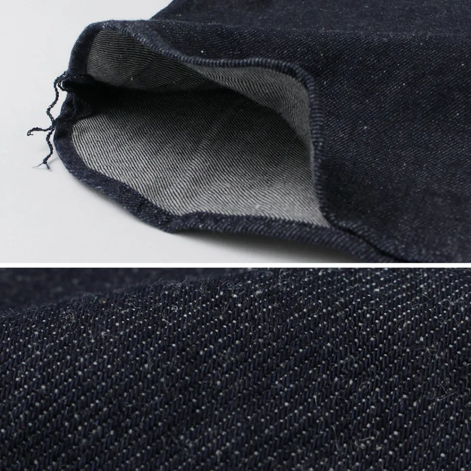 Made with an 8oz denim fabric using cotton and linen nep yarns in the weft. It boasts the dry feel typical of linen blends and a rugged appearance. Despite the firm fabric thickness, the low number of warp threads results in a softer feel with each wash, allowing for aging effects over time.