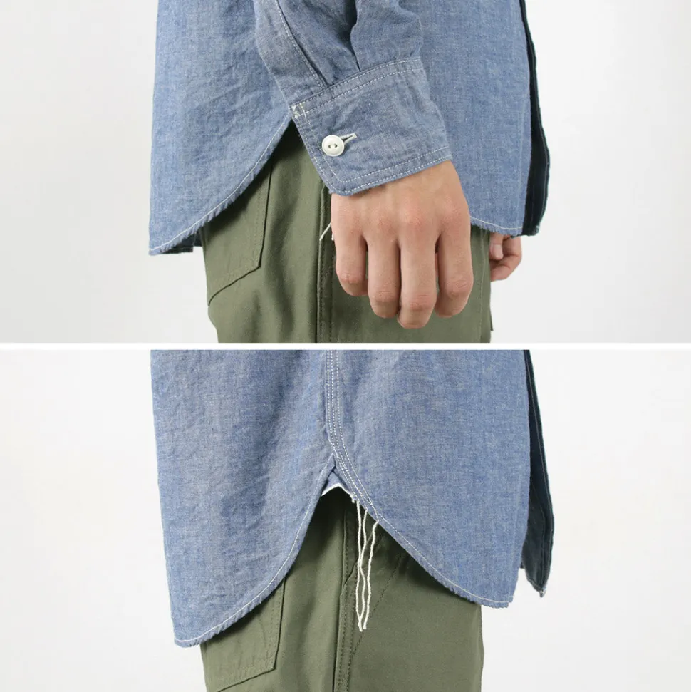 The details of a work shirt, such as triple stitching, gussets at the hem, and an air ring stopper, have been carefully incorporated.