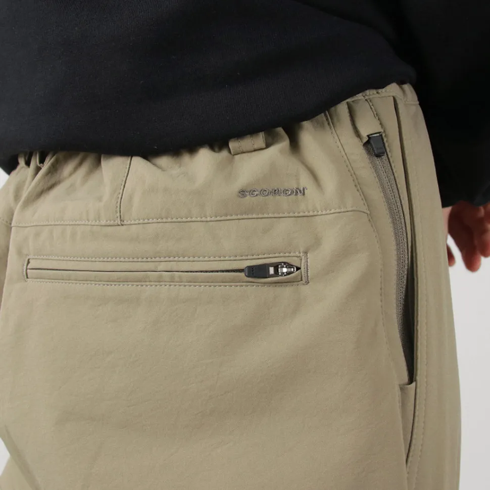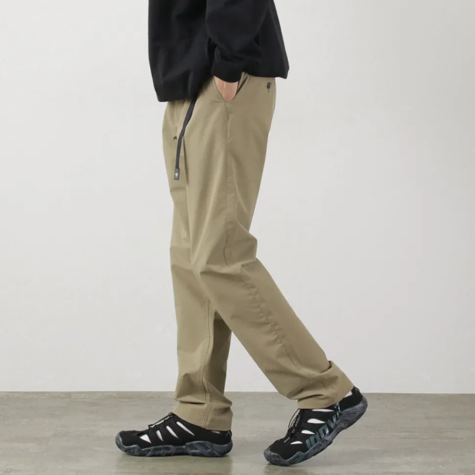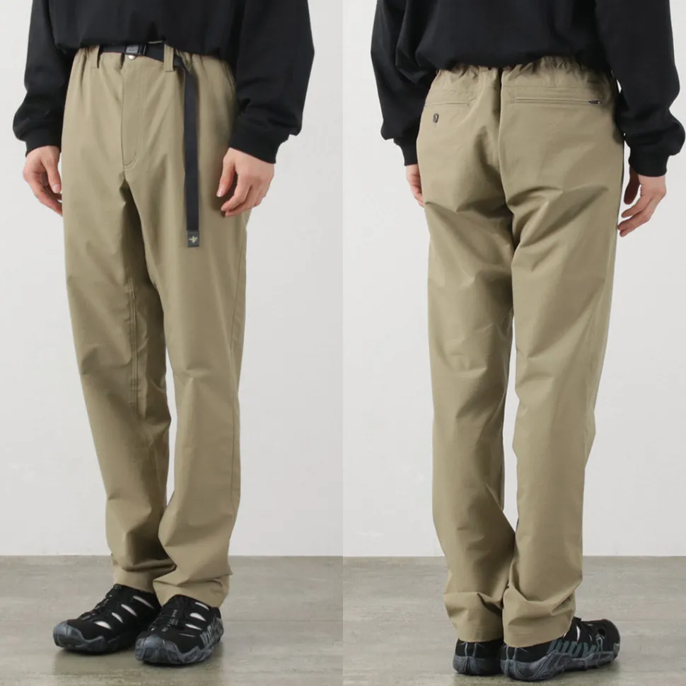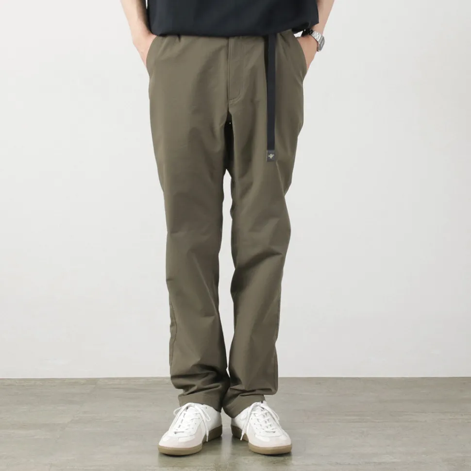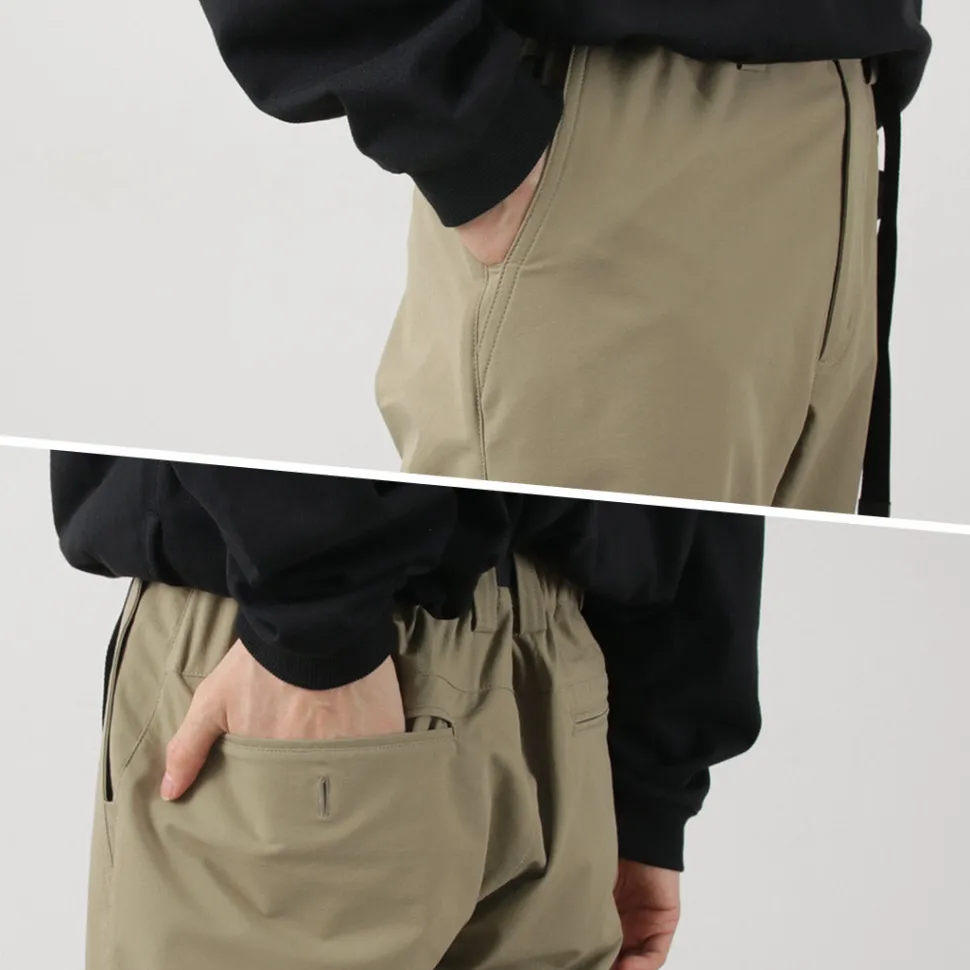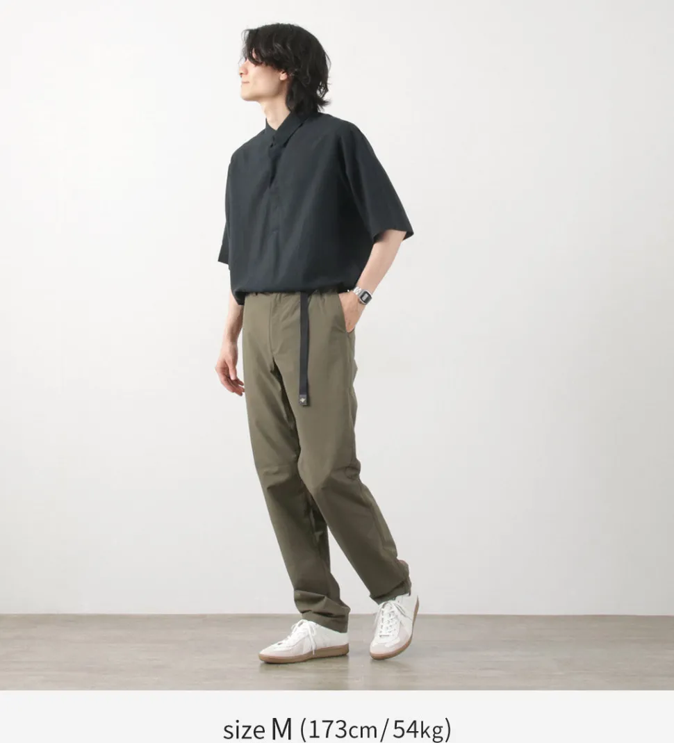 The waist features a full elastic band with an insert-style webbing belt for easy adjustment. The front closure is equipped with a zipper fly. By adjusting the belt, you can achieve a comfortable fit while maintaining a relaxed feel.