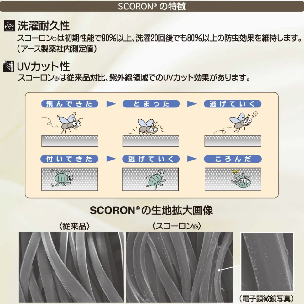 This fabric is specially treated to repel insects from the fibers. When insects land on the fabric surface, they sense the Scorlon and quickly retreat. Additionally, it offers UV protection, shielding you from harmful ultraviolet rays.