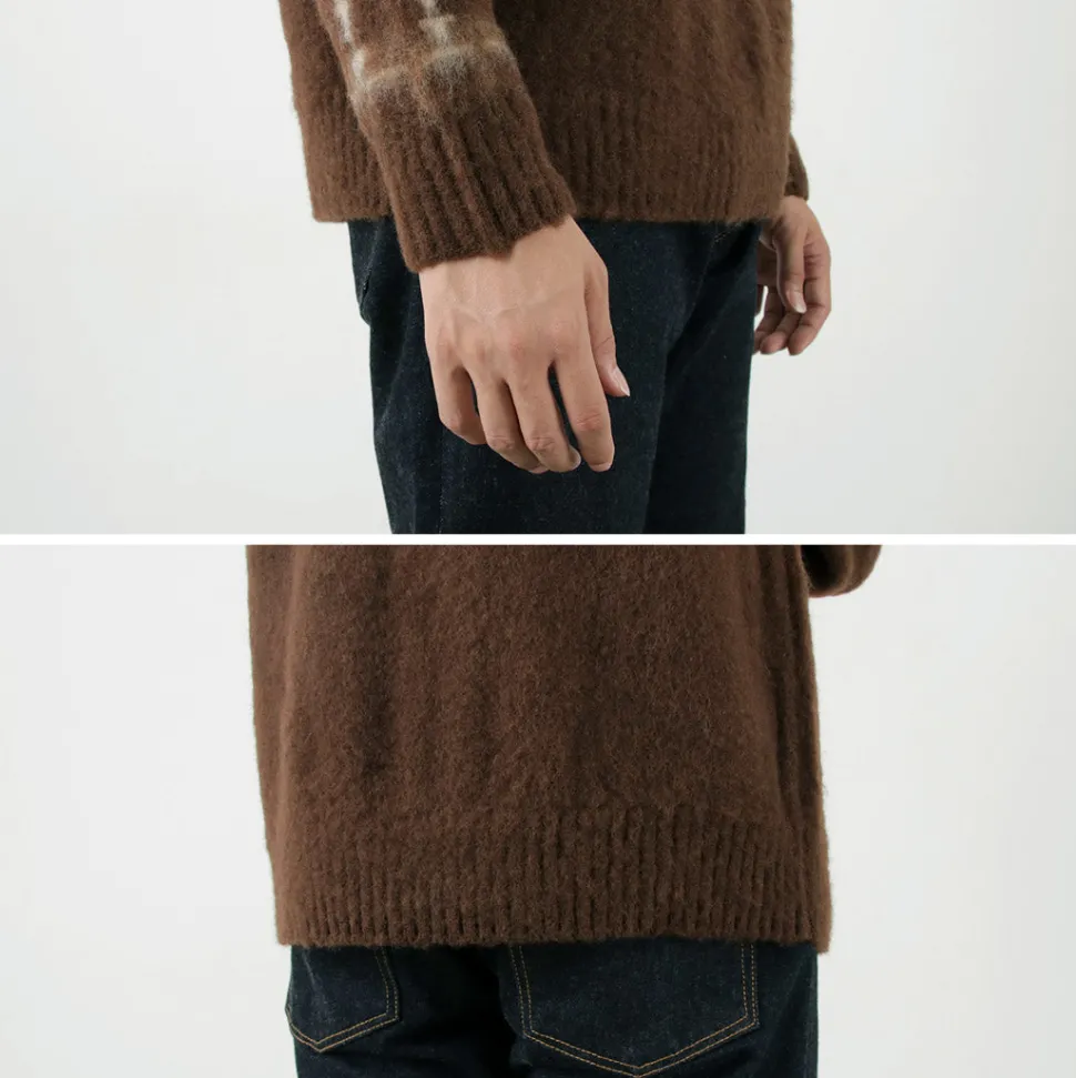 The fabric is 100% wool with a shaggy feel. The texture of an old hand-knitted sweater is expressed in modern machine-knitted fabric, giving it a rough, warm feel and the refined elegance of machine-knitted fabric.