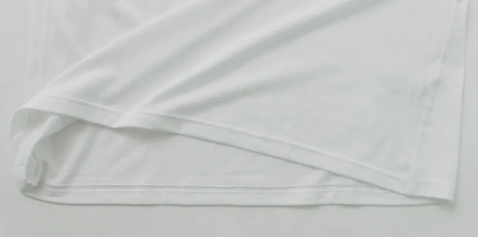 This gem is knitted slowly and gently on an old-fashioned knitting machine using sweetly and softly twisted Supima cotton yarn. This item is full of attention to detail, designed with a pattern that takes advantage of the delicate, supple, thin fabric to ensure that the shoulders sit well when standing up in the T-shirt and that there are no snagging wrinkles on the sides.