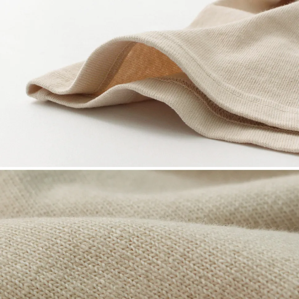 The fabric is made of 100% cotton jersey material knitted with open-end yarns containing air in the fibers. It features a dry touch and a roughly textured natural appearance.
