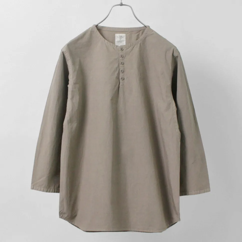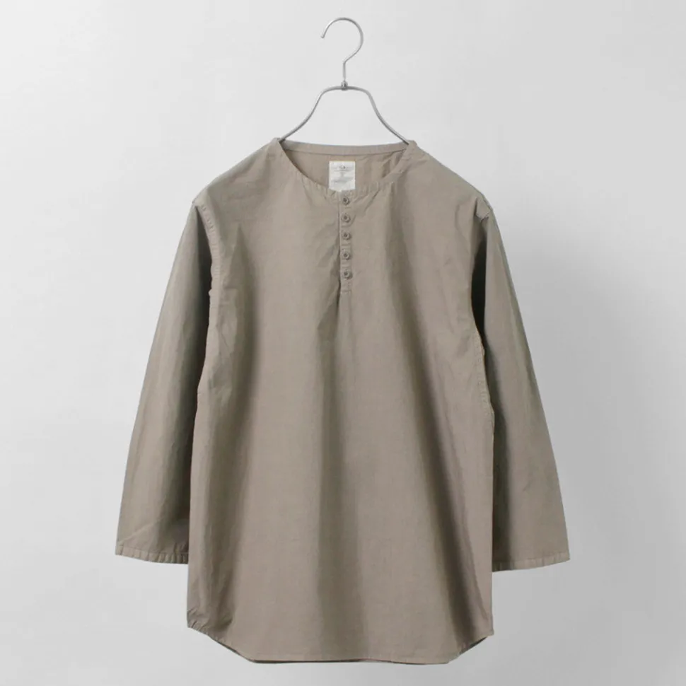 The neck is a henley neck design that can express various nuances by opening and closing the buttons. The small buttons, which match the color of the fabric, add a touch of elegance.