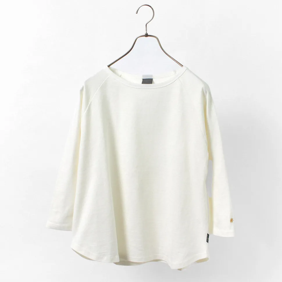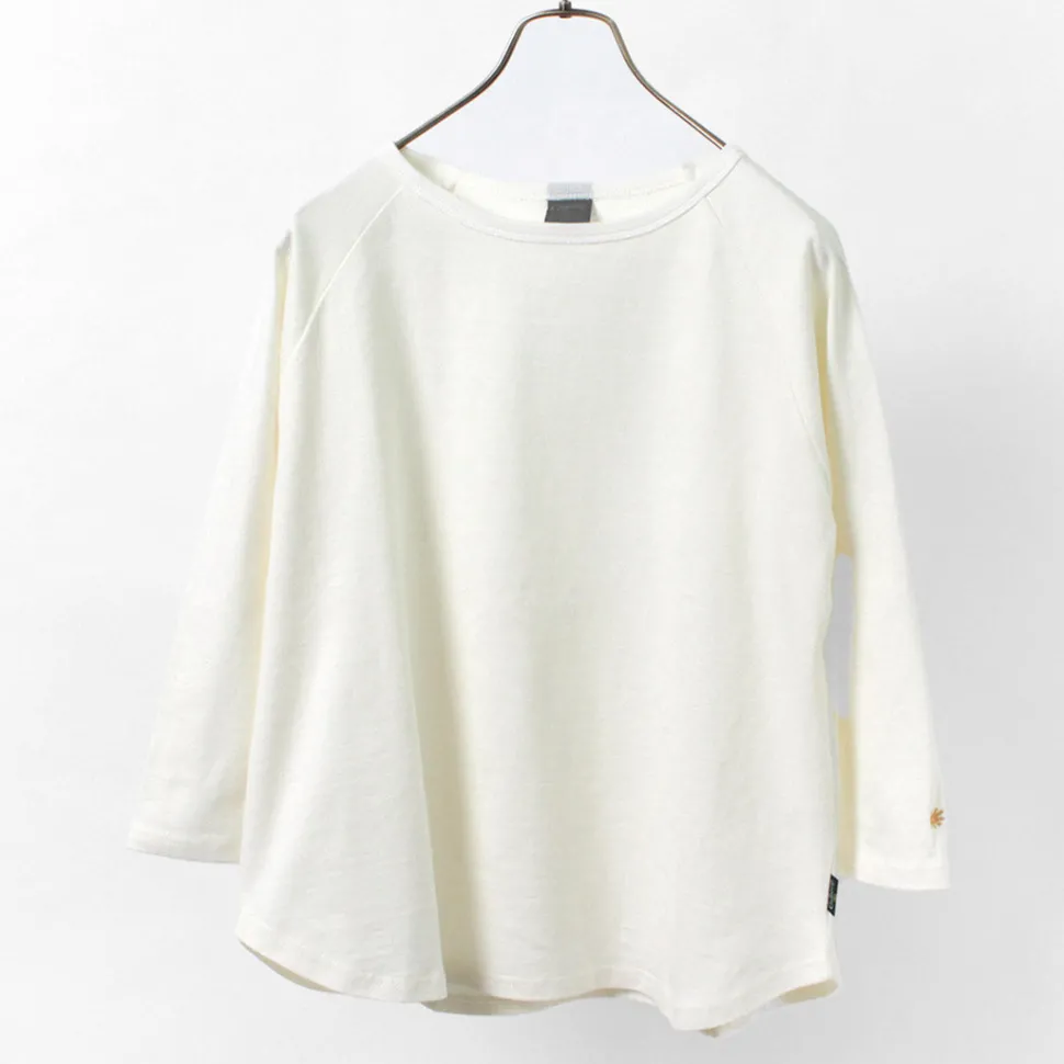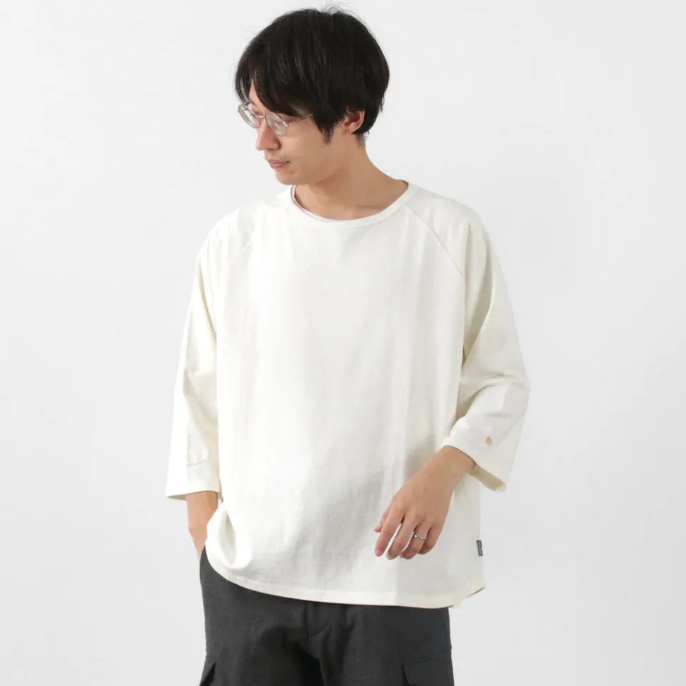 Loose silhouette, three-quarter sleeve T-shirt. Dropped shoulders with a natural texture give it a loose silhouette with a sense of softness.