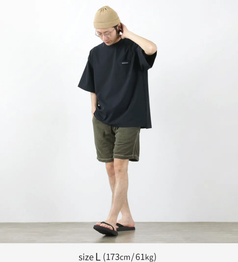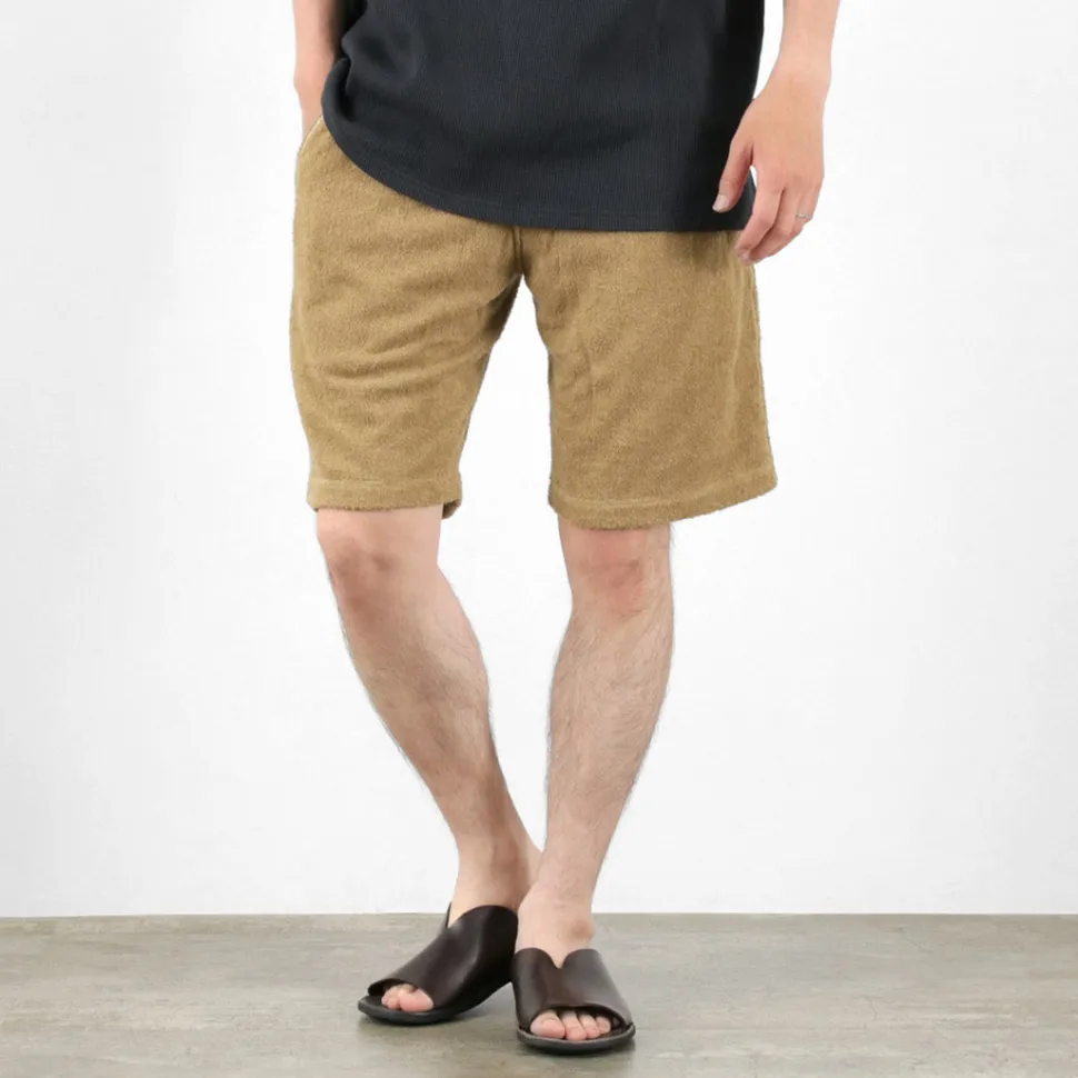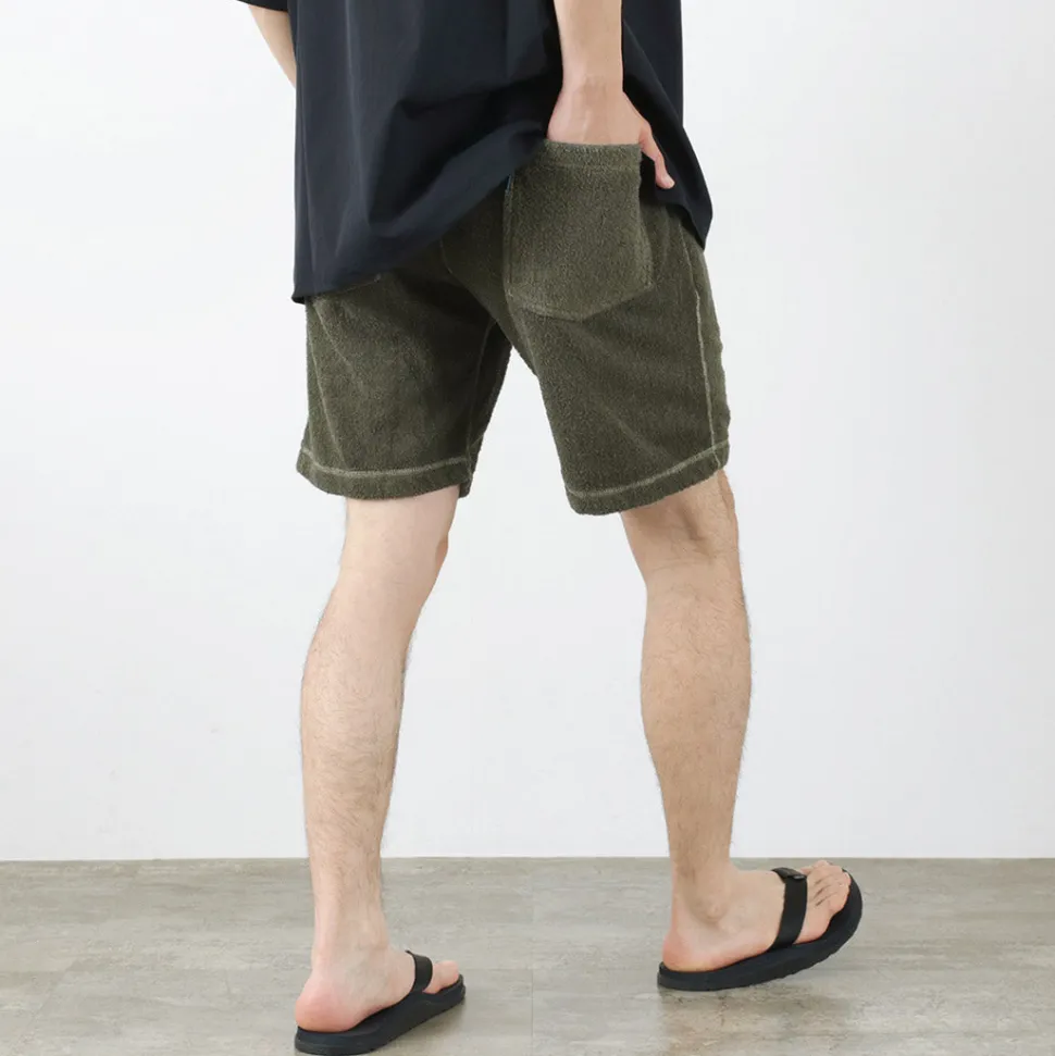 These double-pile shorts offer a smooth and comfortable texture. The rare double-sided pile fabric eliminates the roughness often felt in typical terry cloth or single-sided pile fabrics, resulting in a soft texture.