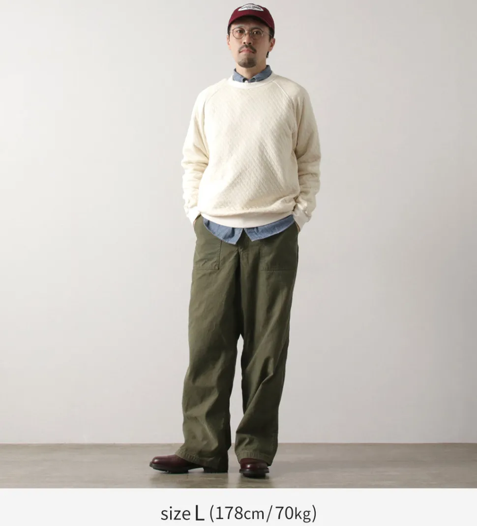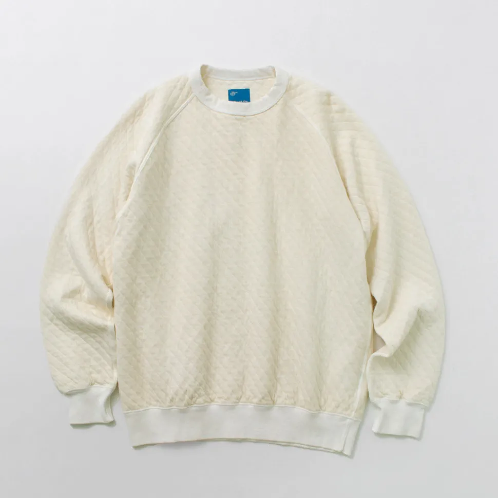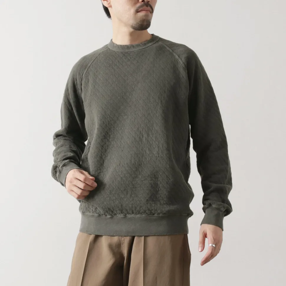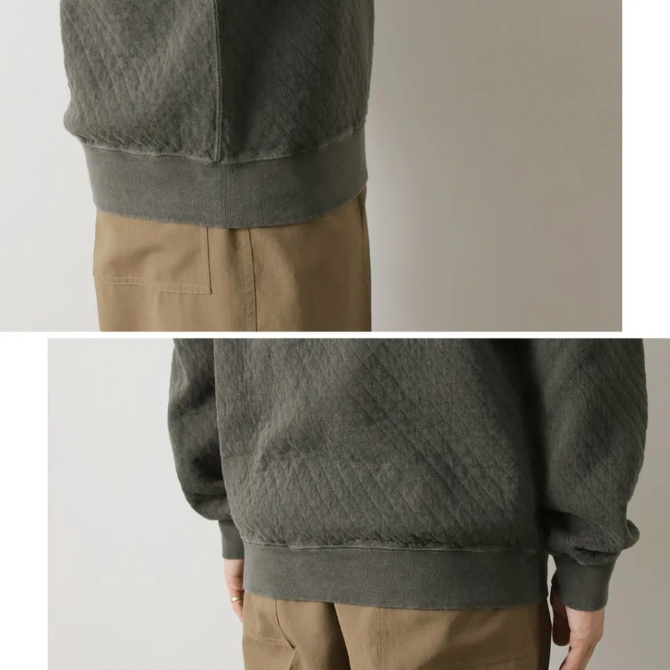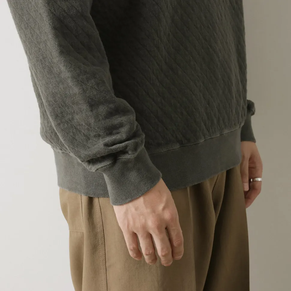This quilted sweatshirt is made from a bundle of stretchy threads containing Photoelectron (R), which are fixed in a diamond pattern. It has been treated with a pigment dye process that gives it a unique vintage feel that only gets better with each wash, making it a sweatshirt you’ll want to grow with.