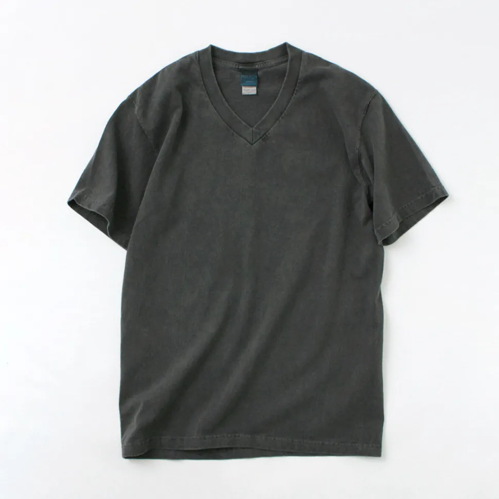 The sharp impression of the V-neck, while rough and casual, and the pigmented dye colour with its deep tasteful look give it a mature atmosphere.