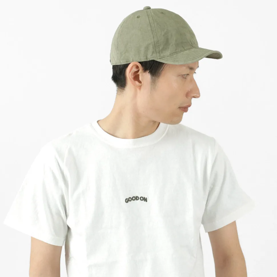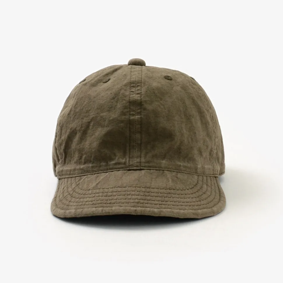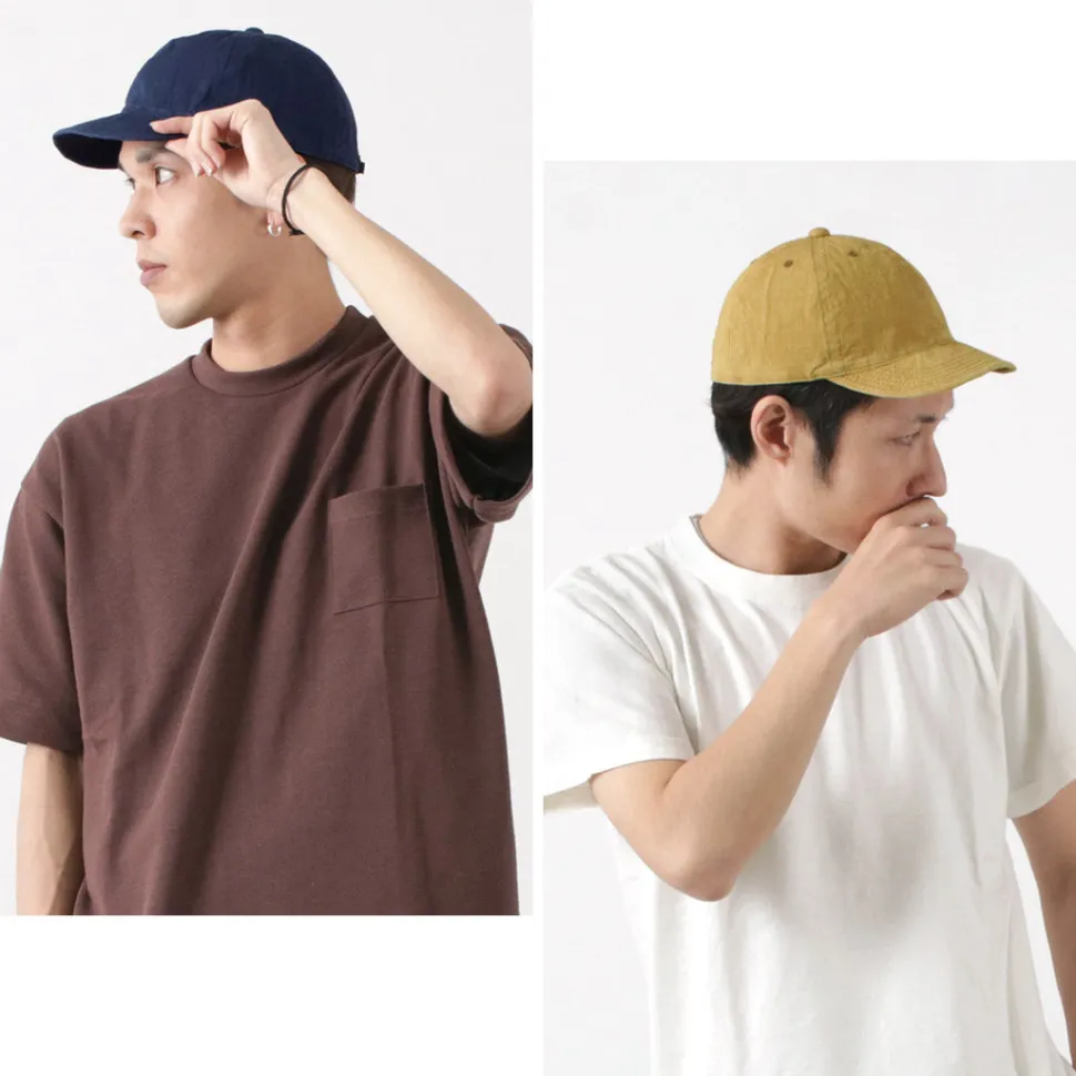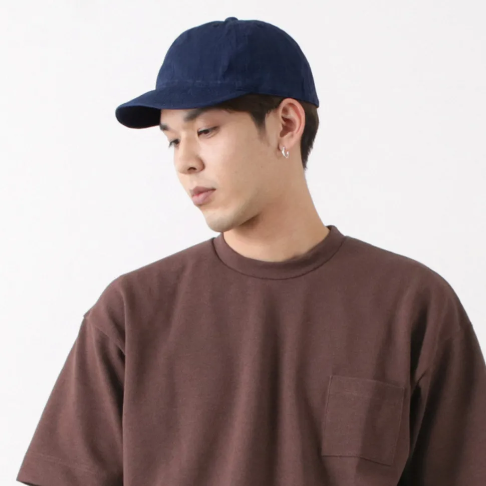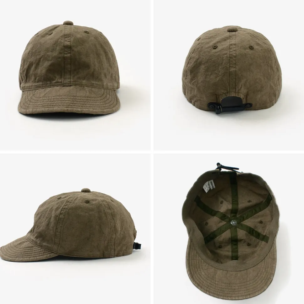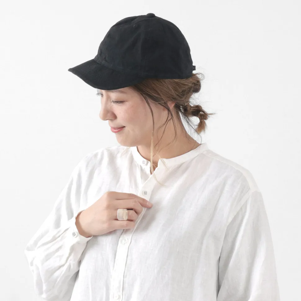 A cool cap made of cotton linen, ideal for spring and summer. The lightweight material and the light colour and uneven look due to the sulphide dyeing. The slightly shallow shape and short brim design gives the cap a sleek and stylish look. This item can be worn with a simple T-shirt style for a stylish look.