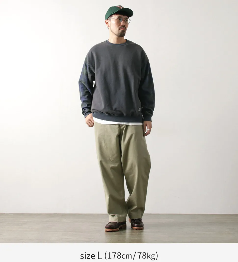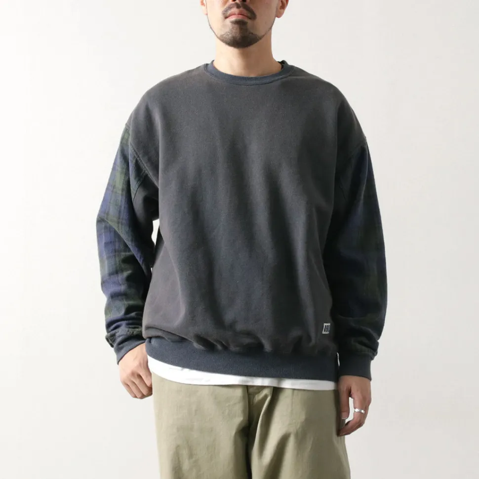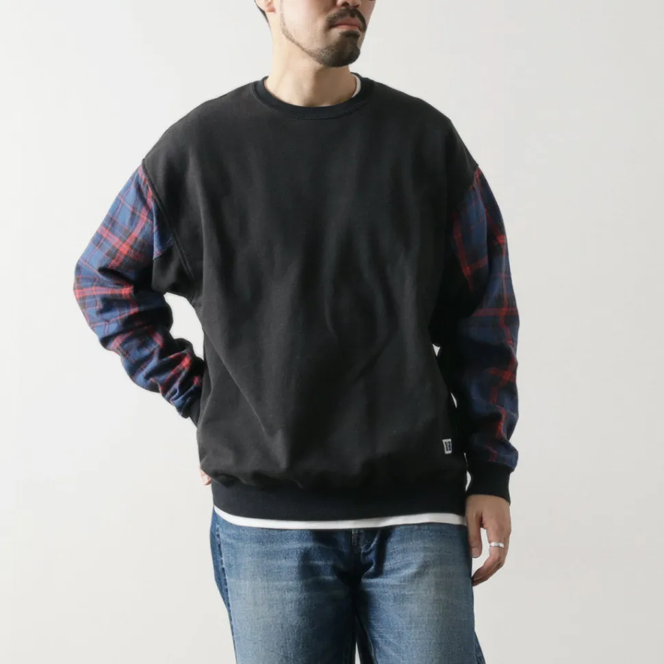 The base fabric is 100% cotton sweat fabric with a dry touch, while the sleeves are made from 100% cotton twill check fabric. Both materials offer a smooth feel, ensuring a comfortable wearing experience. The fabric thickness is just right—not too thin, not too thick—making it perfect to wear on its own in the fall.