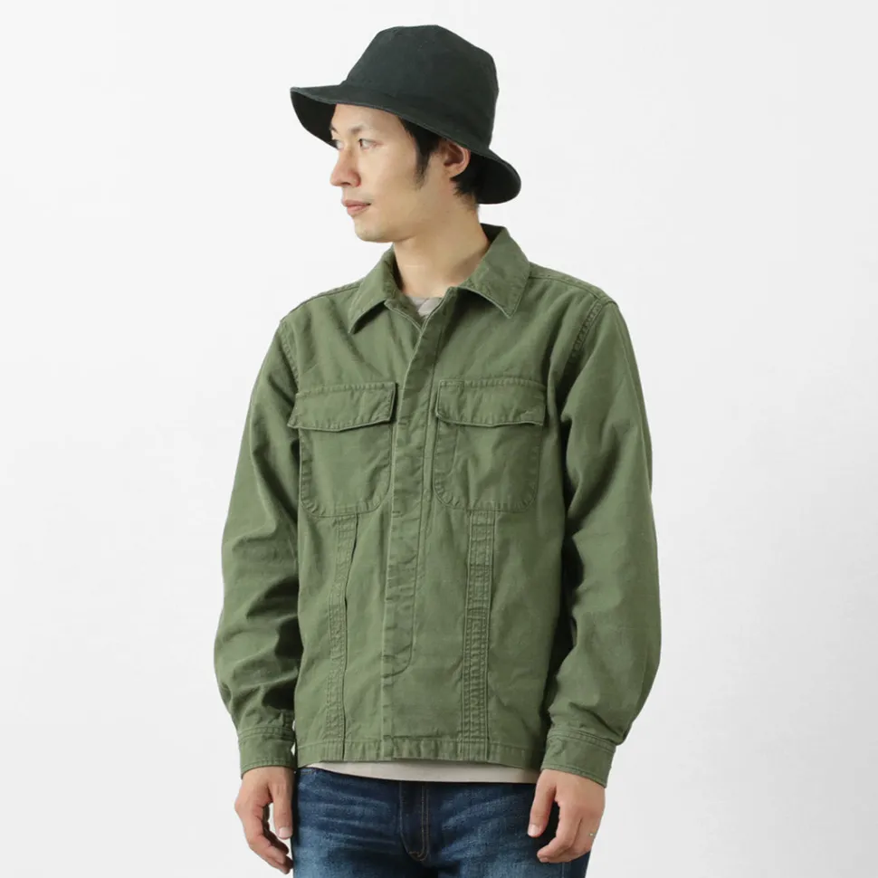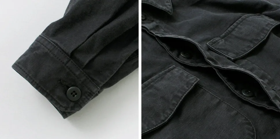 This fatigued jacket is a fusion of American and European military jackets, with the key designs and details extracted from both.