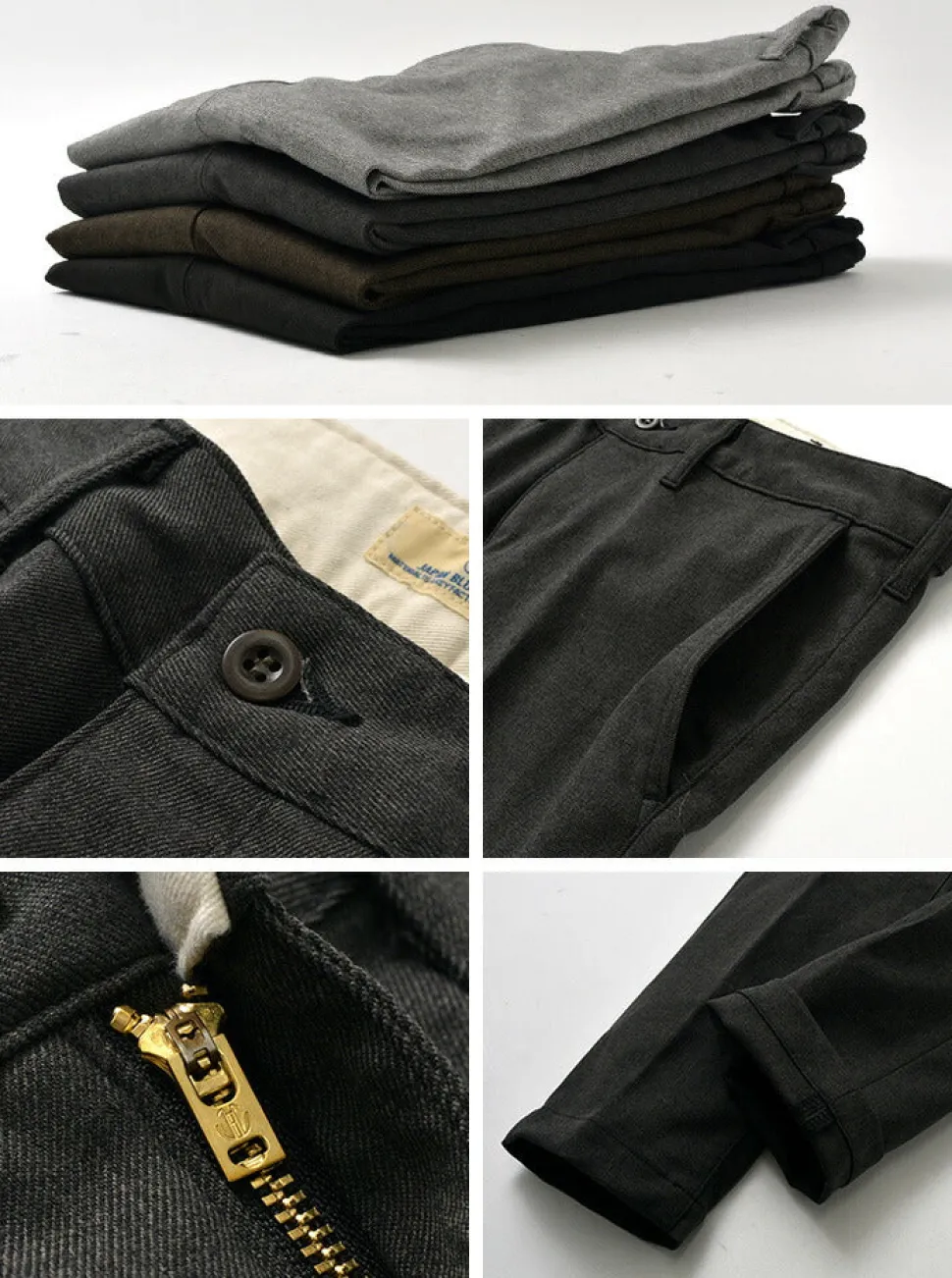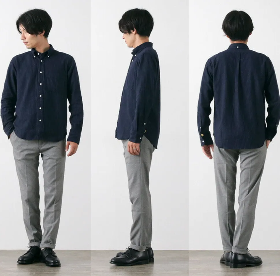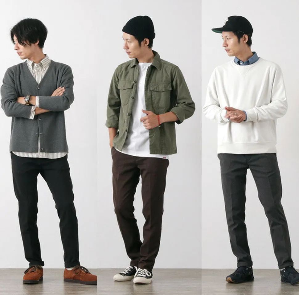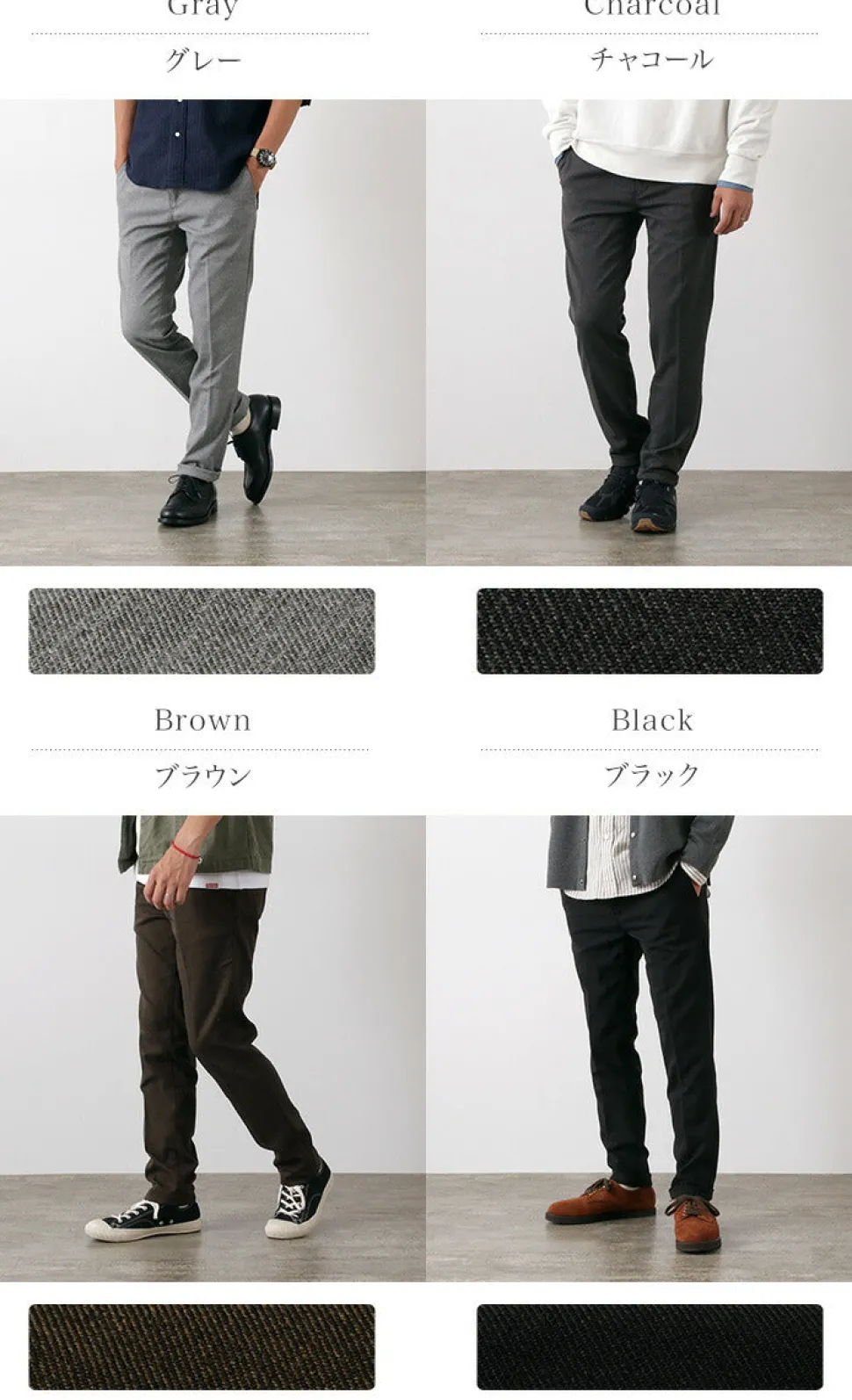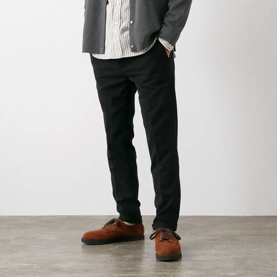 These tapered trousers are neither too thin nor too thick. Tapered trousers. Compared to the slim tapered trousers (JB4100), the tapered trousers are slightly roomier around the thigh and taper gently towards the hem, making them more comfortable to wear.