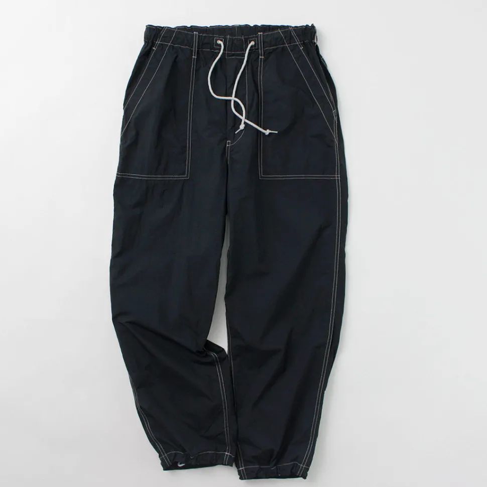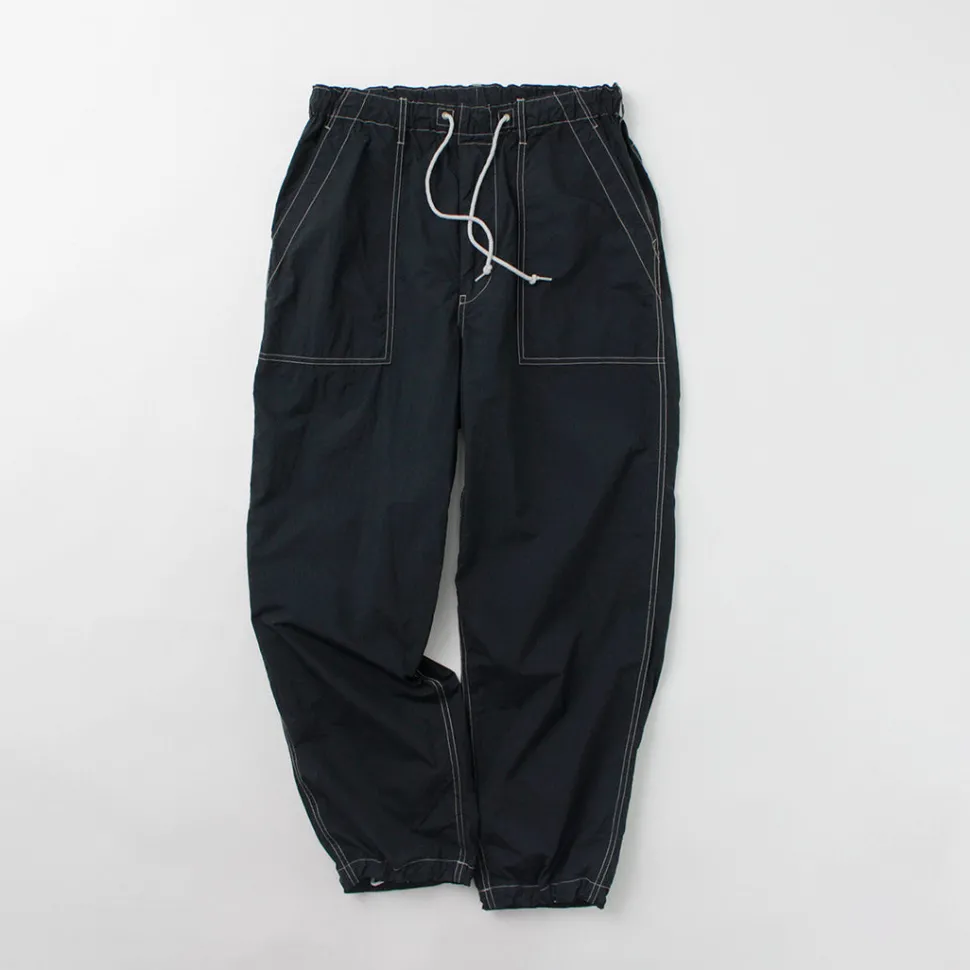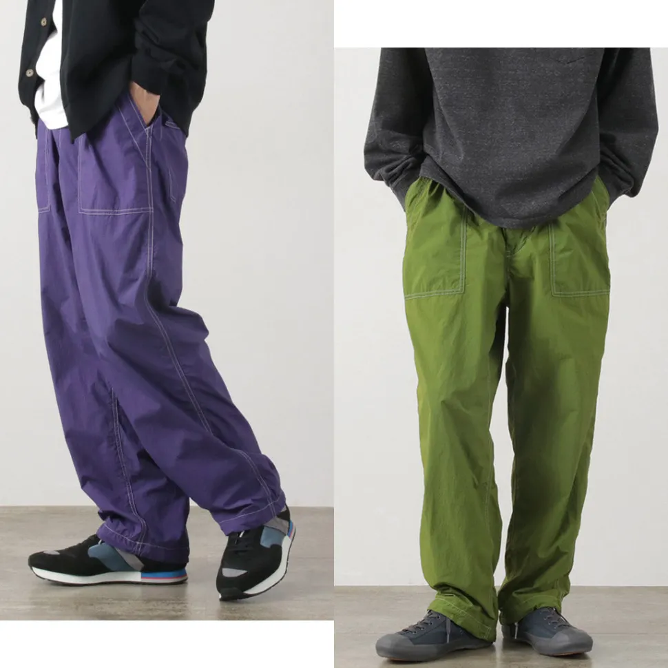This item is based on baker pants and combines the details of easy pants. The fabric is made of lightweight nylon material, and is finished with a tasteful atmosphere by applying garment dyeing. In addition, the use of a special processing technology gives the item various functionalities that can be expected to have a wellness effect.