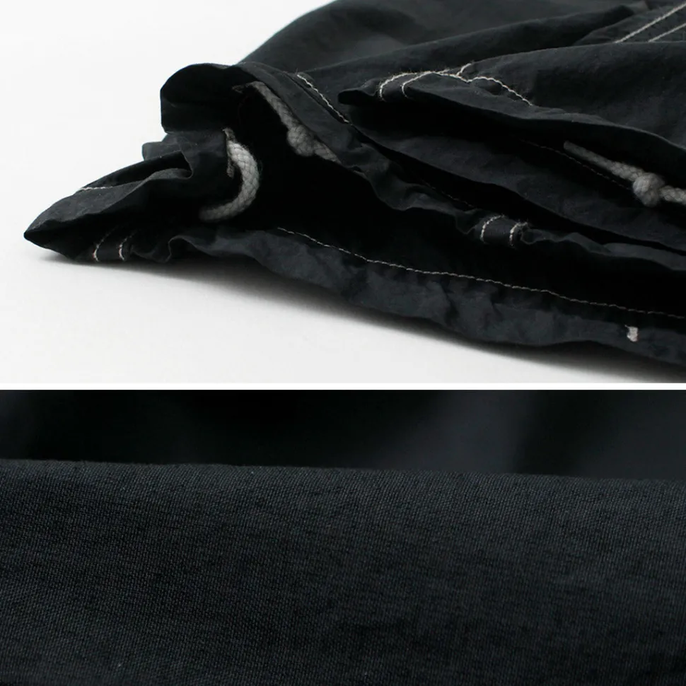 Made of lightweight and crisp 100% nylon fabric. Through garment dyeing, uneven dyeing appears on the overlapping and seam parts of the fabric, creating a tasteful atmosphere.