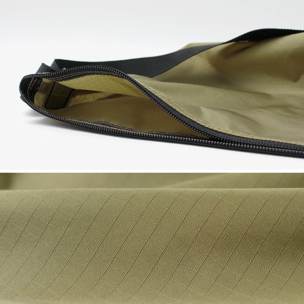The fabric used is ripstop nylon, woven in a grid pattern. This material is lightweight and thin, yet highly resistant to tearing, commonly used in tents and sleeping bags due to its durability.