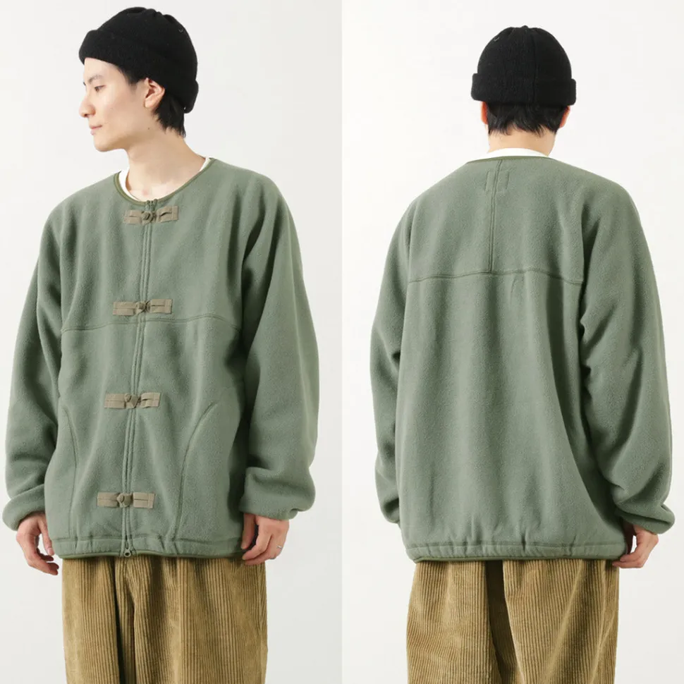 This design incorporates elements of a traditional Chinese jacket into a fleece jacket found in outdoor wear. The main feature of this jacket is the Chinese buttons on the front, which are made of nylon ripstop fabric. In addition, the switch at the chest and the stitching work on the pockets provide subtle accents.