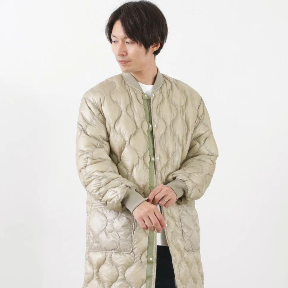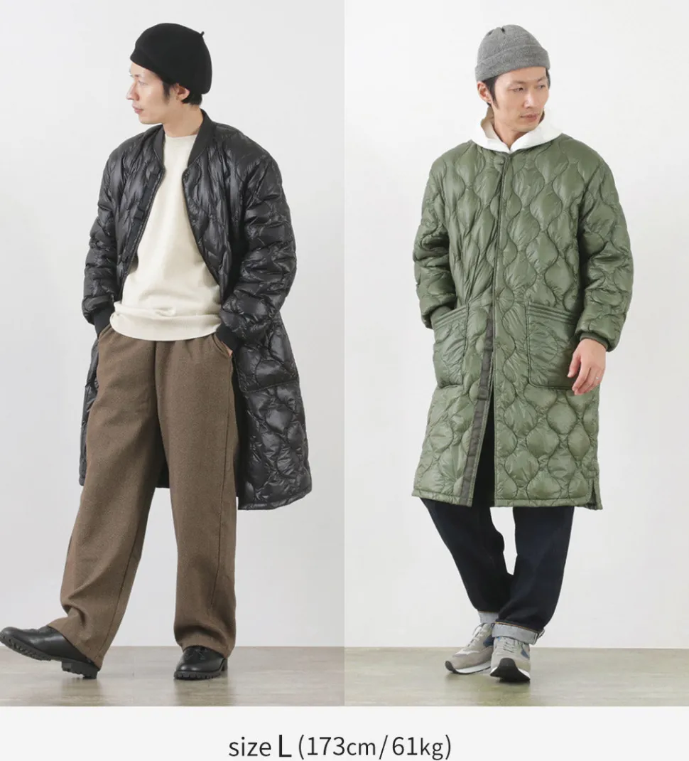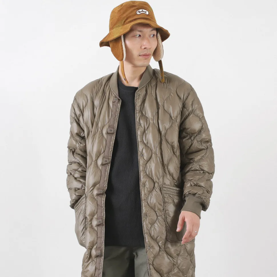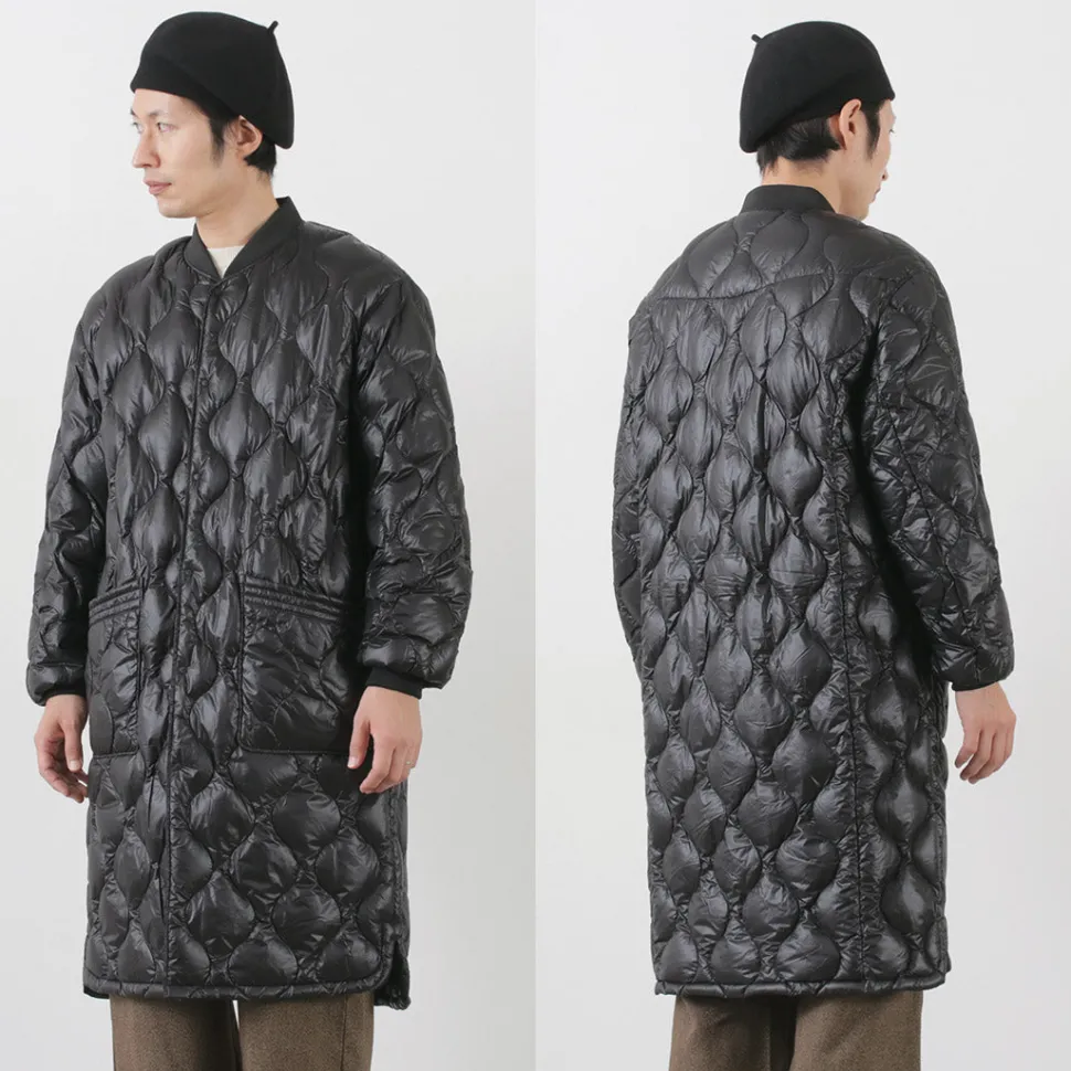 Long down coat with a quilted design based on a military coat liner. Can be worn on its own or as an inner layer for an overcoat, allowing you to enjoy a variety of styling options.