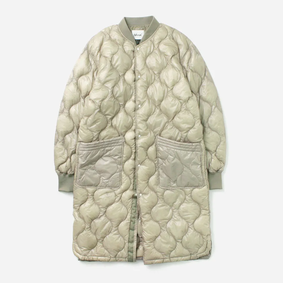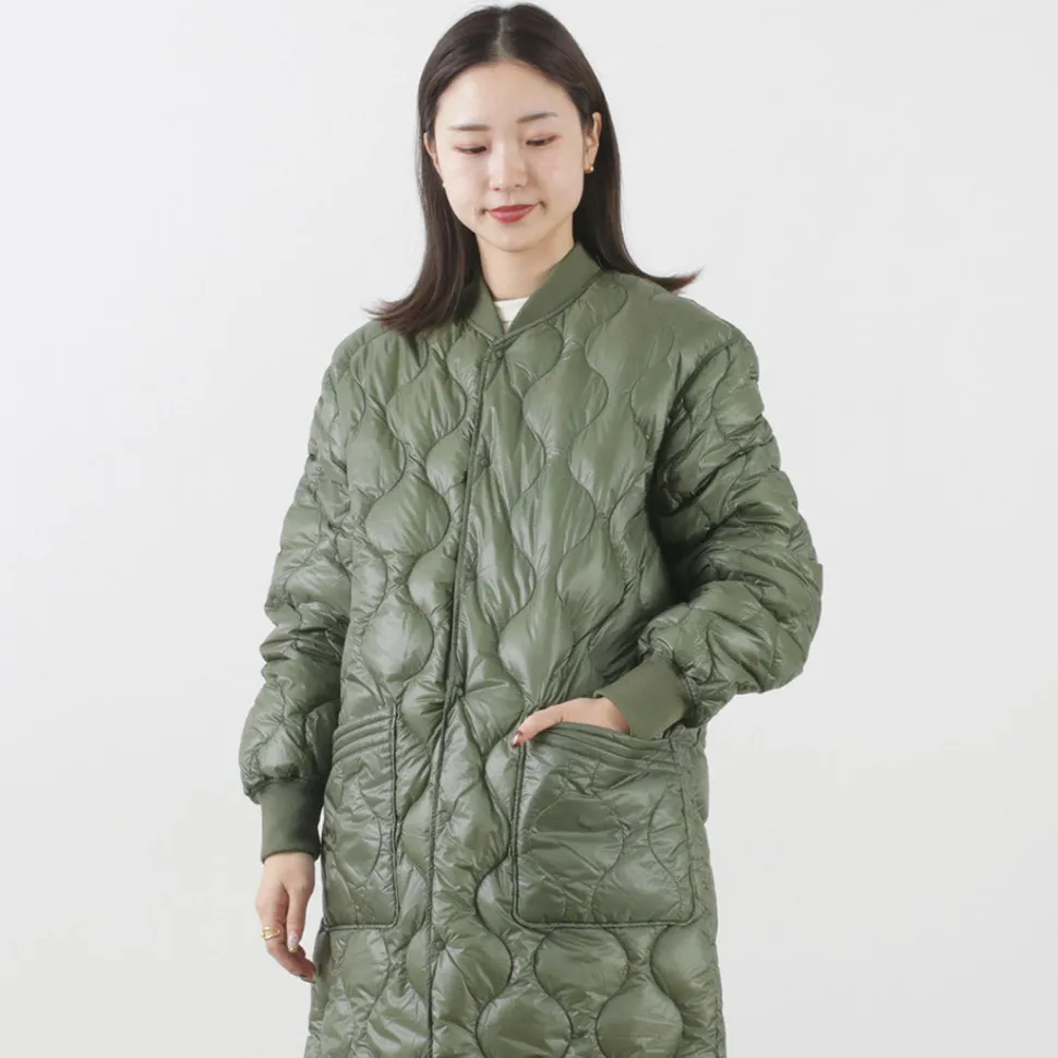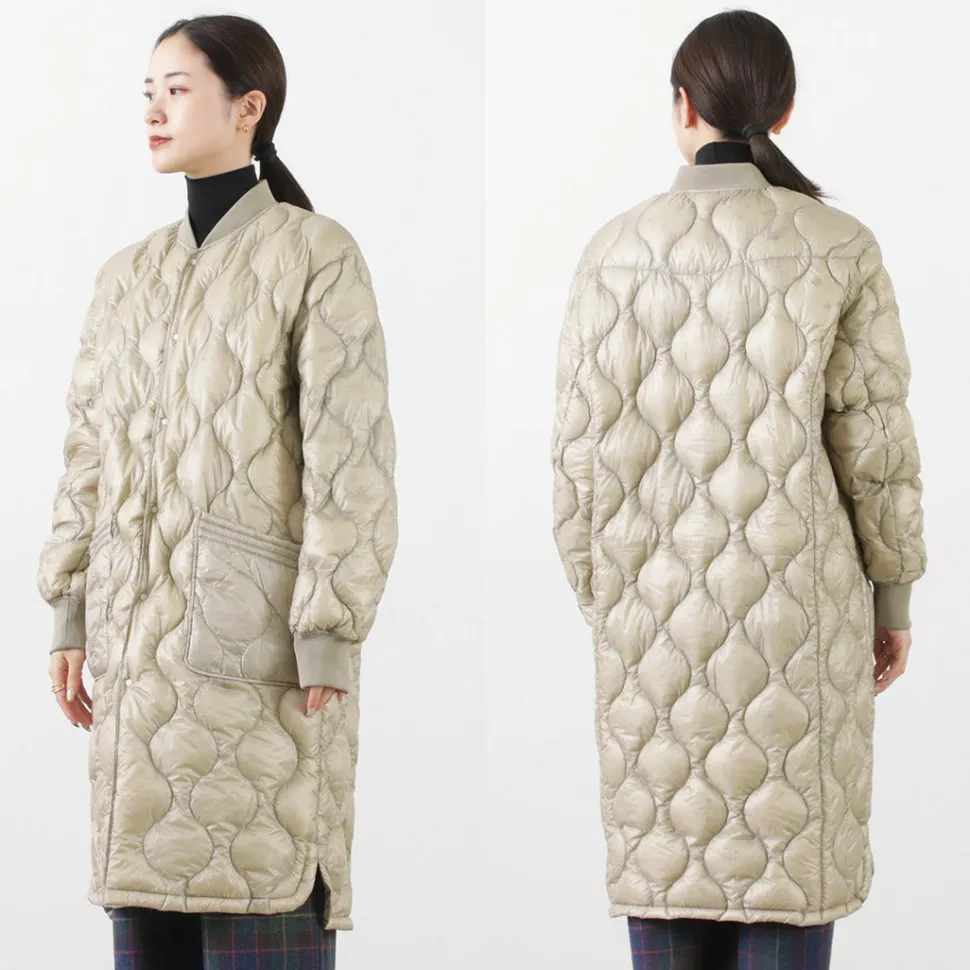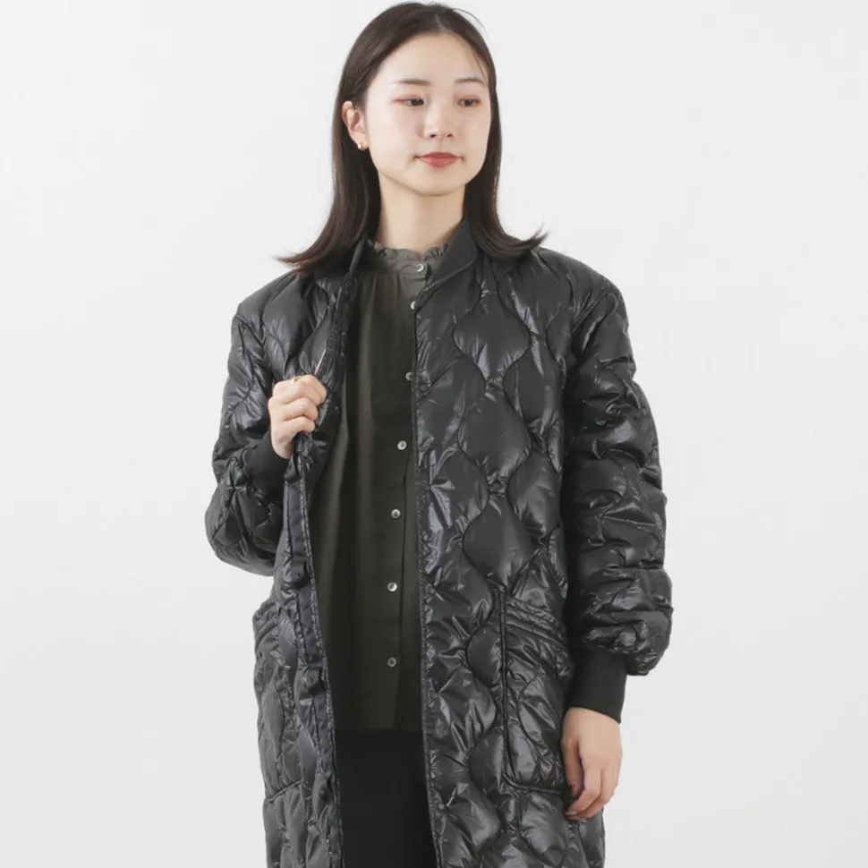 Long down coat with a quilted design based on a military coat liner. Can be worn on its own or as an inner layer for an overcoat, allowing you to enjoy a variety of styling options.