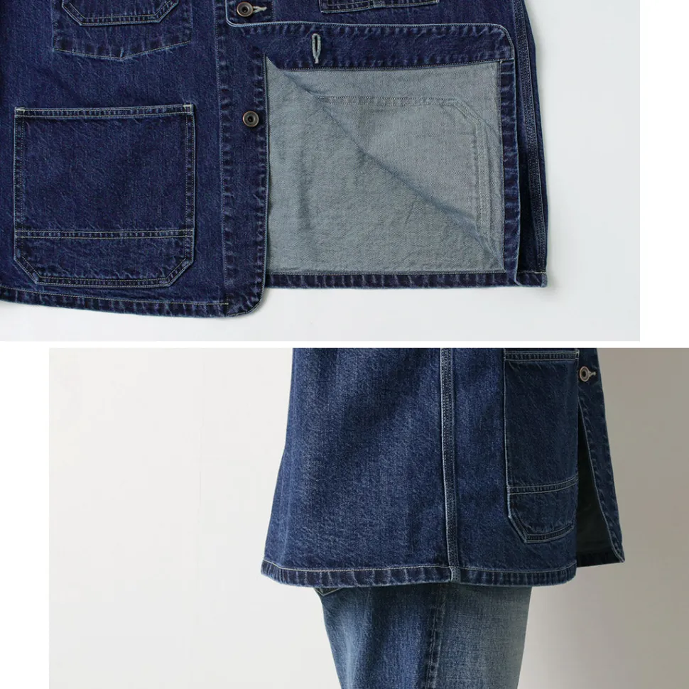 This piece is infused with design elements from 1920s U.S. workwear. Details like the chin strap at the neck, donut buttons, and front pockets add a rugged touch typical of workwear.