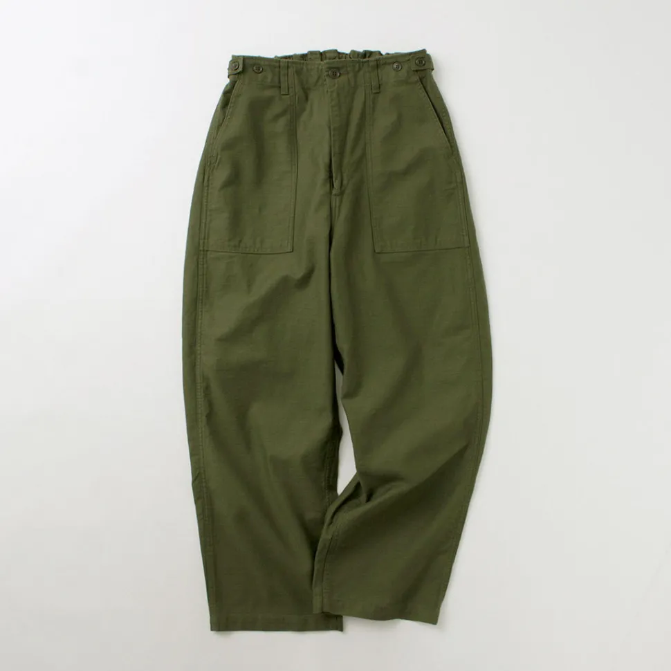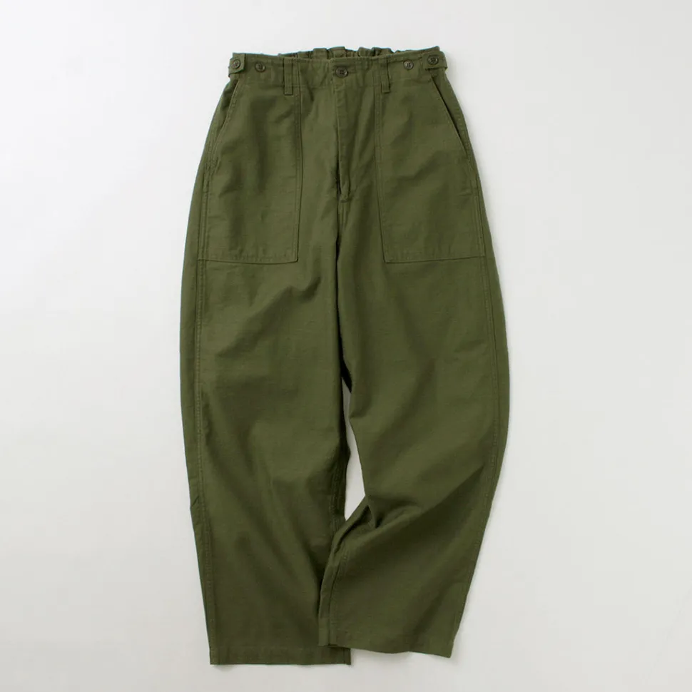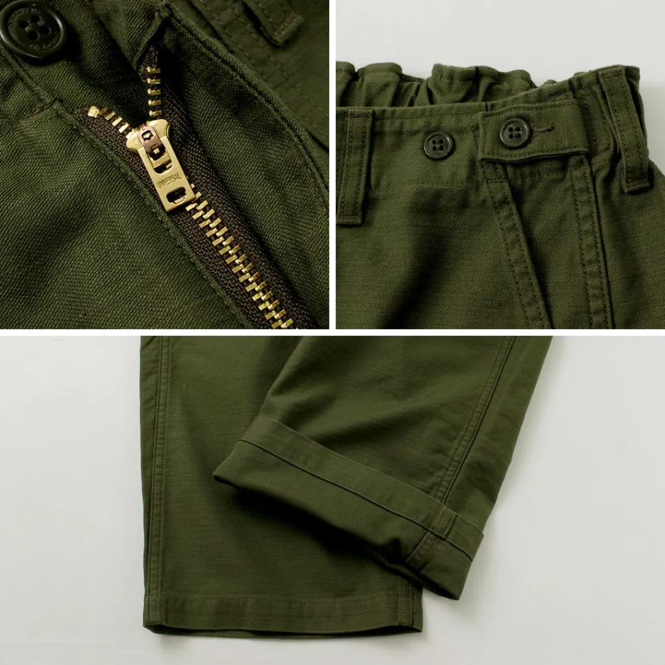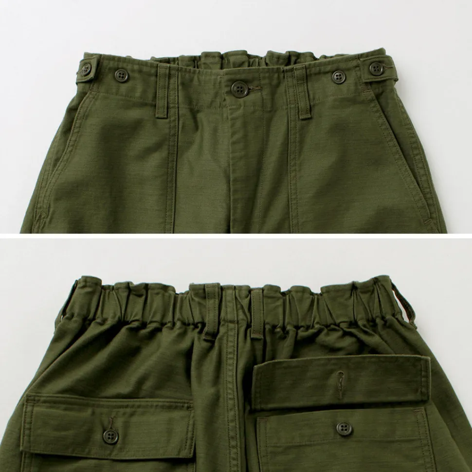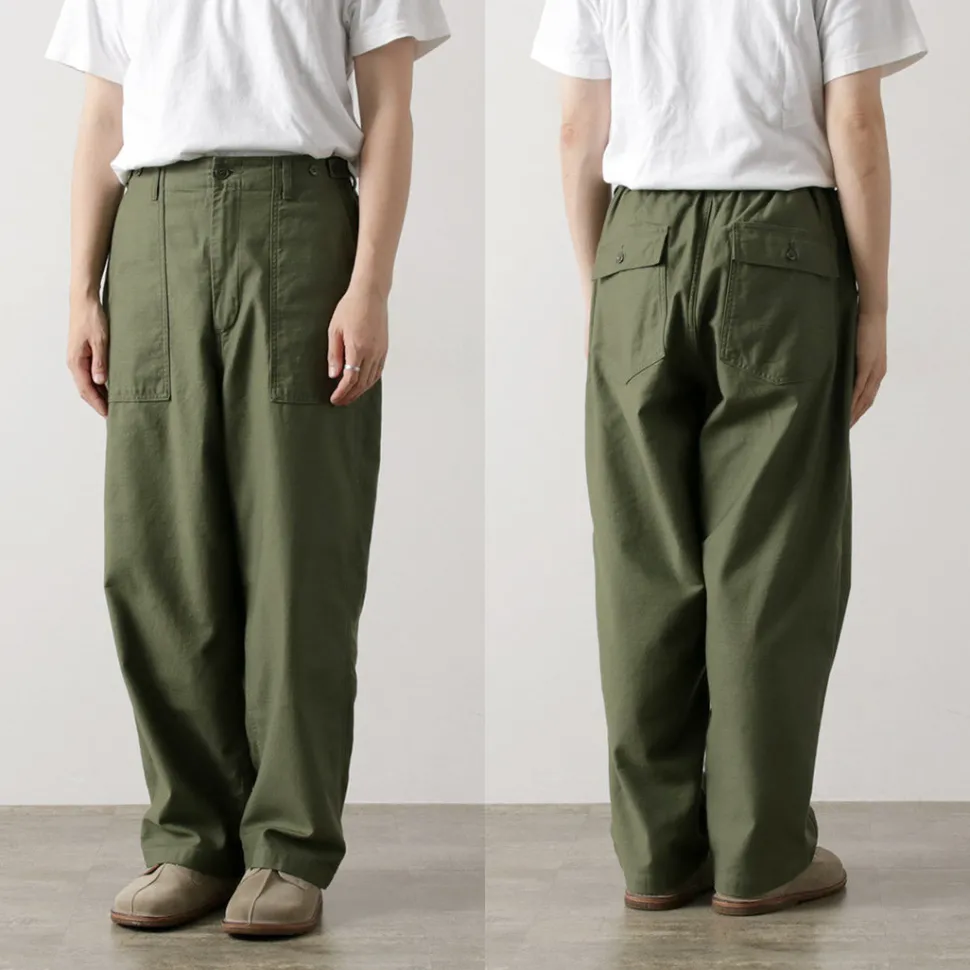 The front features a zip fly with an original branded top button. The waistline is flat in the front, giving a clean look when tucked in, while the back has an elastic waistband for added comfort. Additionally, side buttons allow for minor waist adjustments, making it easy to fit various body types.
