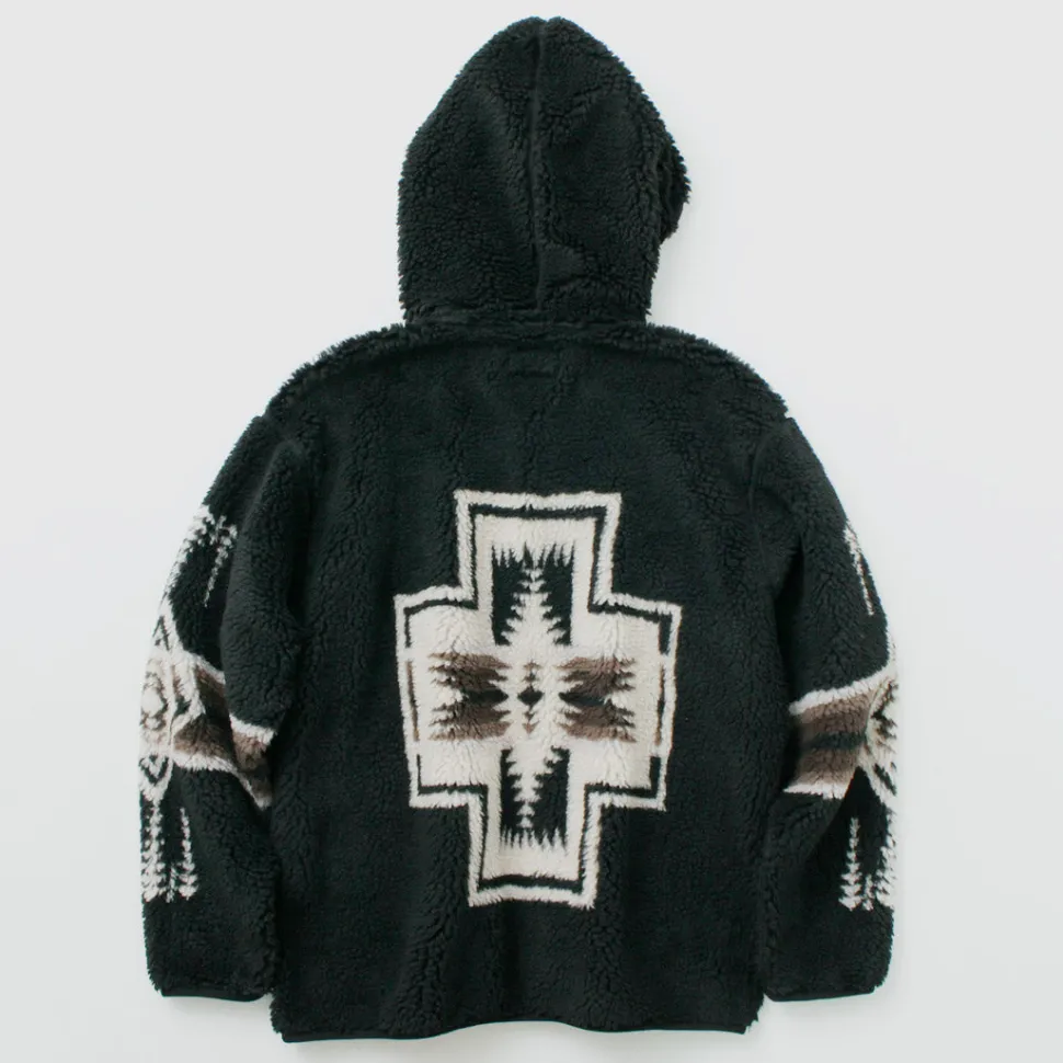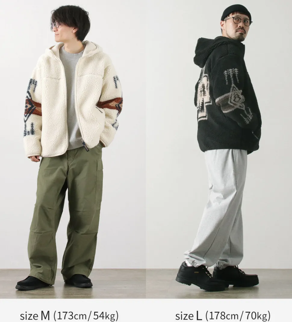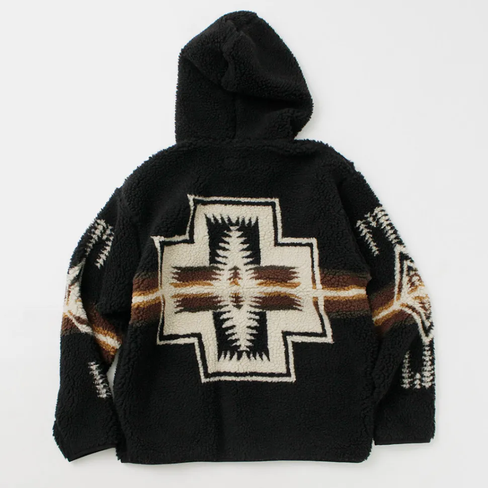 This boa hoodie features a unique PENDLETON-style herringbone pattern on the back. It can be worn by both men and women, and is characterized by its roomy fit.