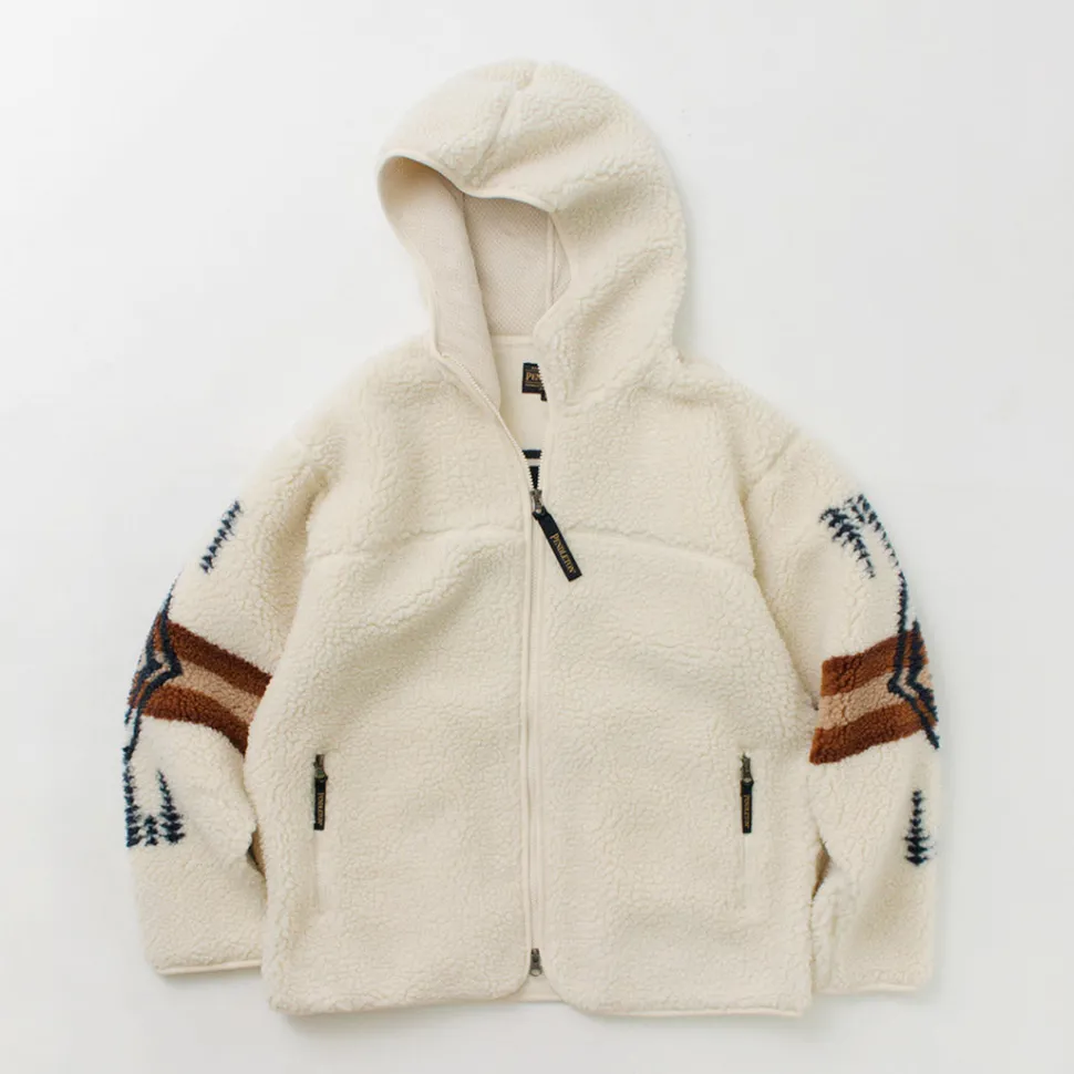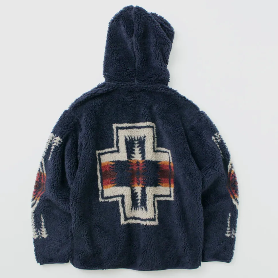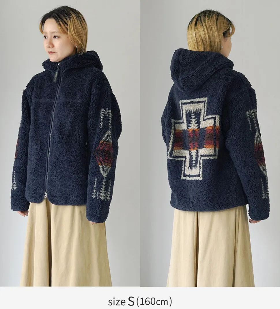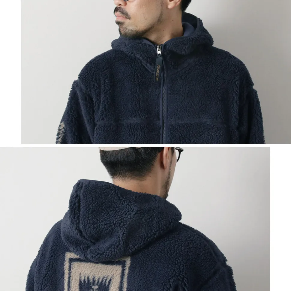 This boa hoodie features a unique PENDLETON-style herringbone pattern on the back. It can be worn by both men and women, and is characterized by its roomy fit.
