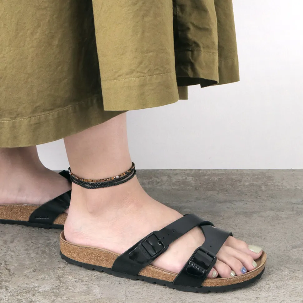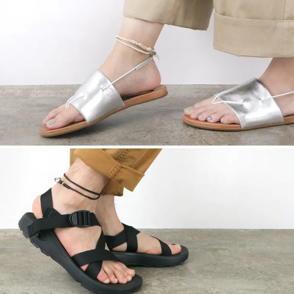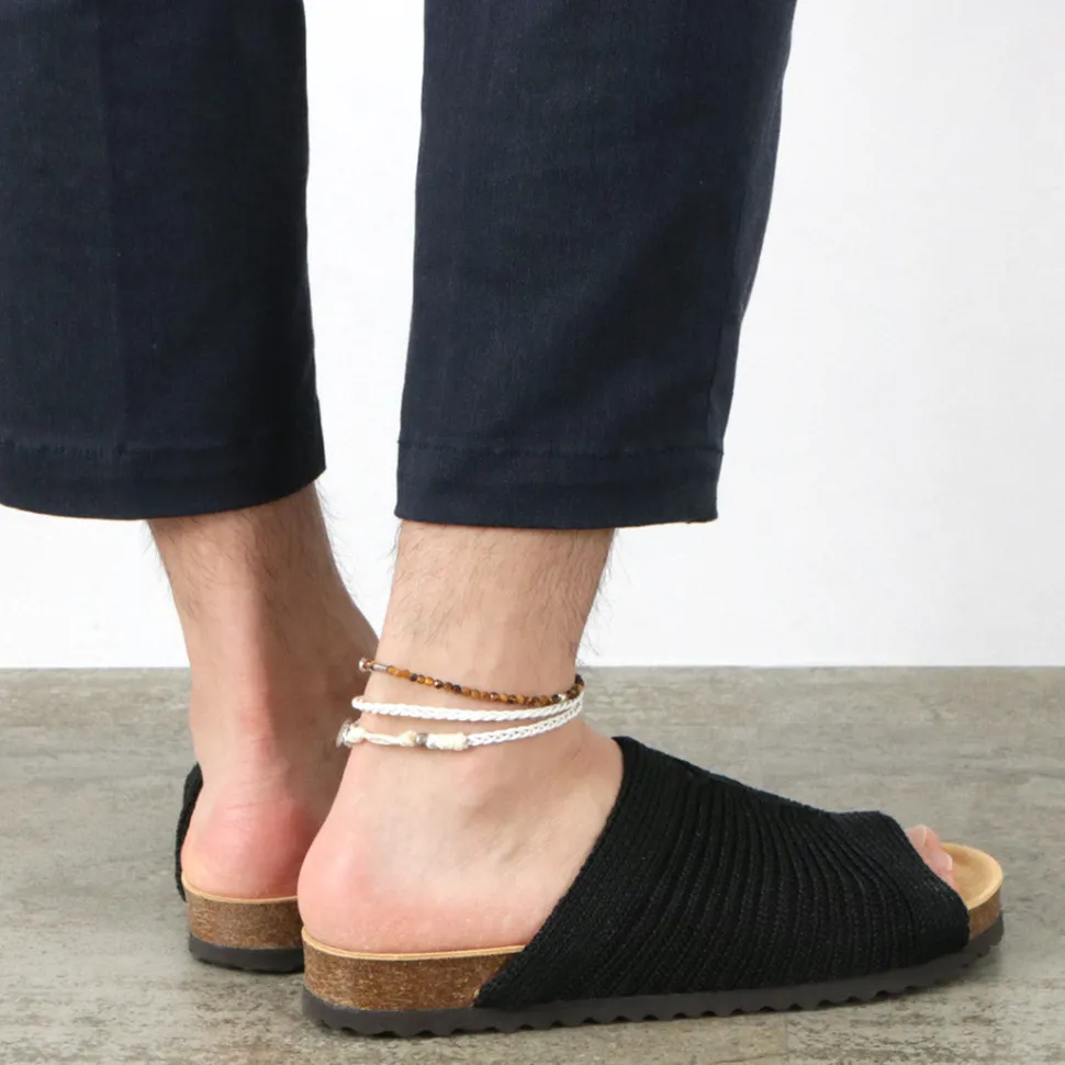 A double anklet design crafted by intertwining genuine leather cords with warm Karen silver. The Karen silver, each uniquely handmade, accentuates the texture of the leather.
