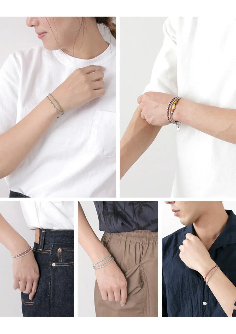This bracelet is made of waxed cord and Karen silver and has a simple yet strong presence. It will casually decorate your wrist. The bracelet is water resistant, so you can enjoy summer activities with it on! As a coordinating accent, it is sure to enhance your summer style. It can be worn in layers depending on your mood, purpose, or location. It goes well with cords and other bead accessories. Available in two sizes for unisex wear, and in seven colors, it makes a perfect pair accessory or gift.