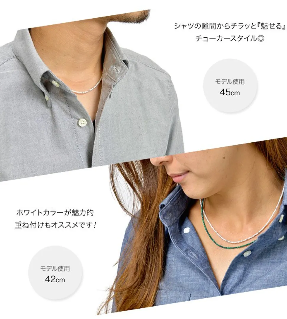Beautiful white “Howlite” and warm Karen silver 2-way accessoryThis is an accessory using beautiful white mysterious Howlite cut beads and Karen brass beads made by hand one by one. The white color, which cannot be expressed with other materials, is a great accent. Howlite, a symbol of peace and wisdom, is a stone that brings a sense of security and stability. Brass Beads Handcrafted by the Karen TribeKaren beads are handcrafted by a small group of mountain tribes in Myanmar and northern Thailand. These beads are handcrafted one by one and take a long time to make, but the warmth of the handmade beads gives them a simple yet strong presence, making them very popular in the West. Length: 42cm, 45cm, 50cmSize: Bead width 2mm, joint (clasp part) maximum 5mm widthProduction Country: MADE IN THILANDMaterial: Howlite (magnesite, natural stone), brass