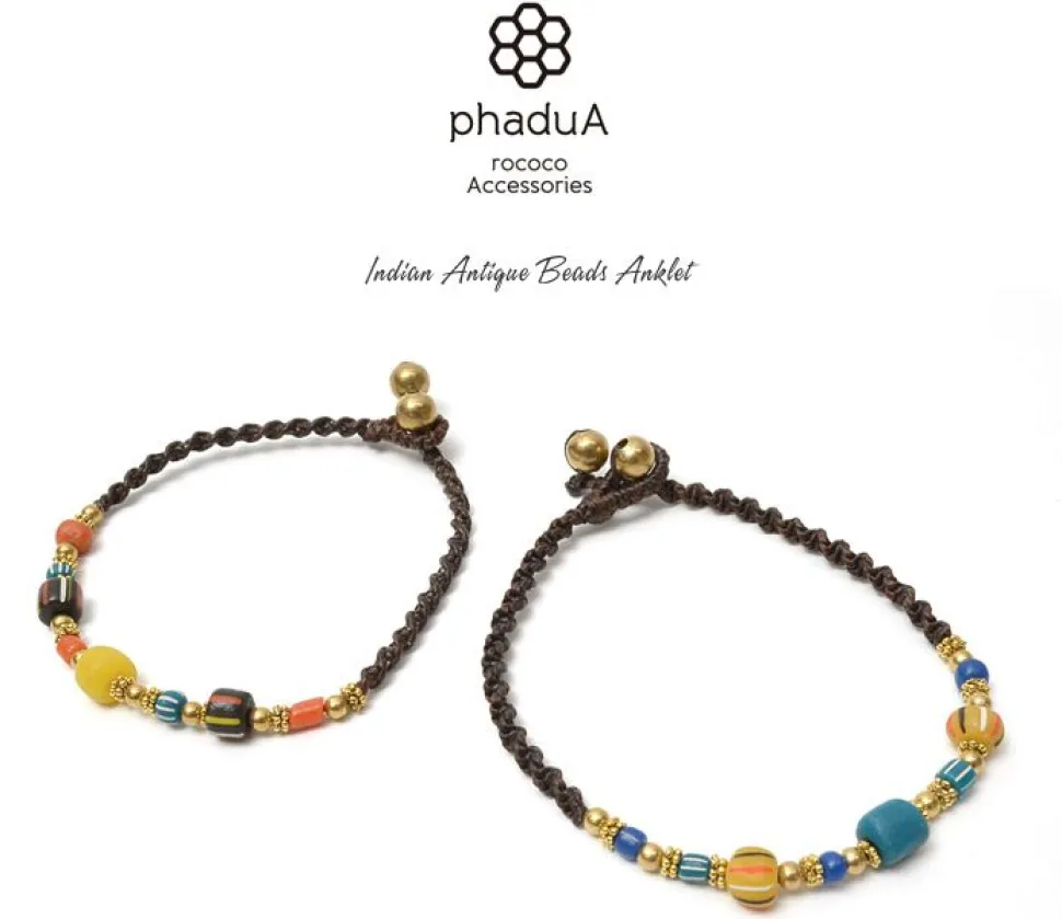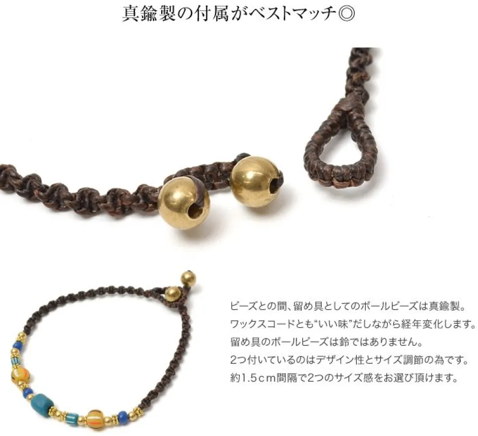 Handmade Vintage Indian Beads Vintage Indian beads with unique coloring and uneven individuality are very impressive. The color and size of the glass beads are not stable, but by dividing them into red multi and blue multi, we were able to create a certain sense of uniformity, while still making the most of their “individuality”. Waxed cord is strong enough to be left on all day and is resistant to water. It also gives it a nice texture when used. The ball beads between the beads and the clasp are made of brass. The brass ball bead between the beads and the clasp is made of brass, and it will change over time with the wax cord, giving it a nice “flavor”. The ball beads for the clasp are not bells; they are used for design purposes and size adjustment. The two beads are for design and size adjustment. Size / S/M approx. 22.5-24cm / approx. 24.5-26cm Origin: MADE IN THAILAND Material: Wax cord, handmade beads, brass