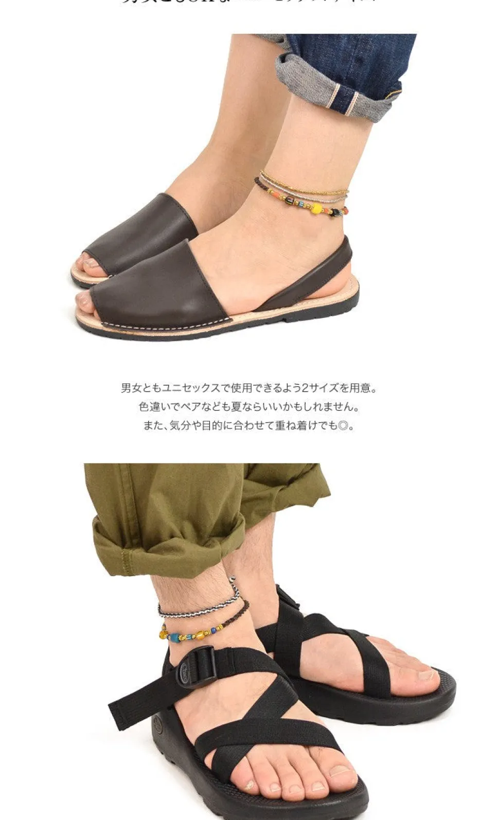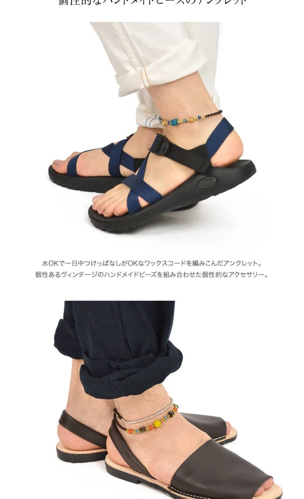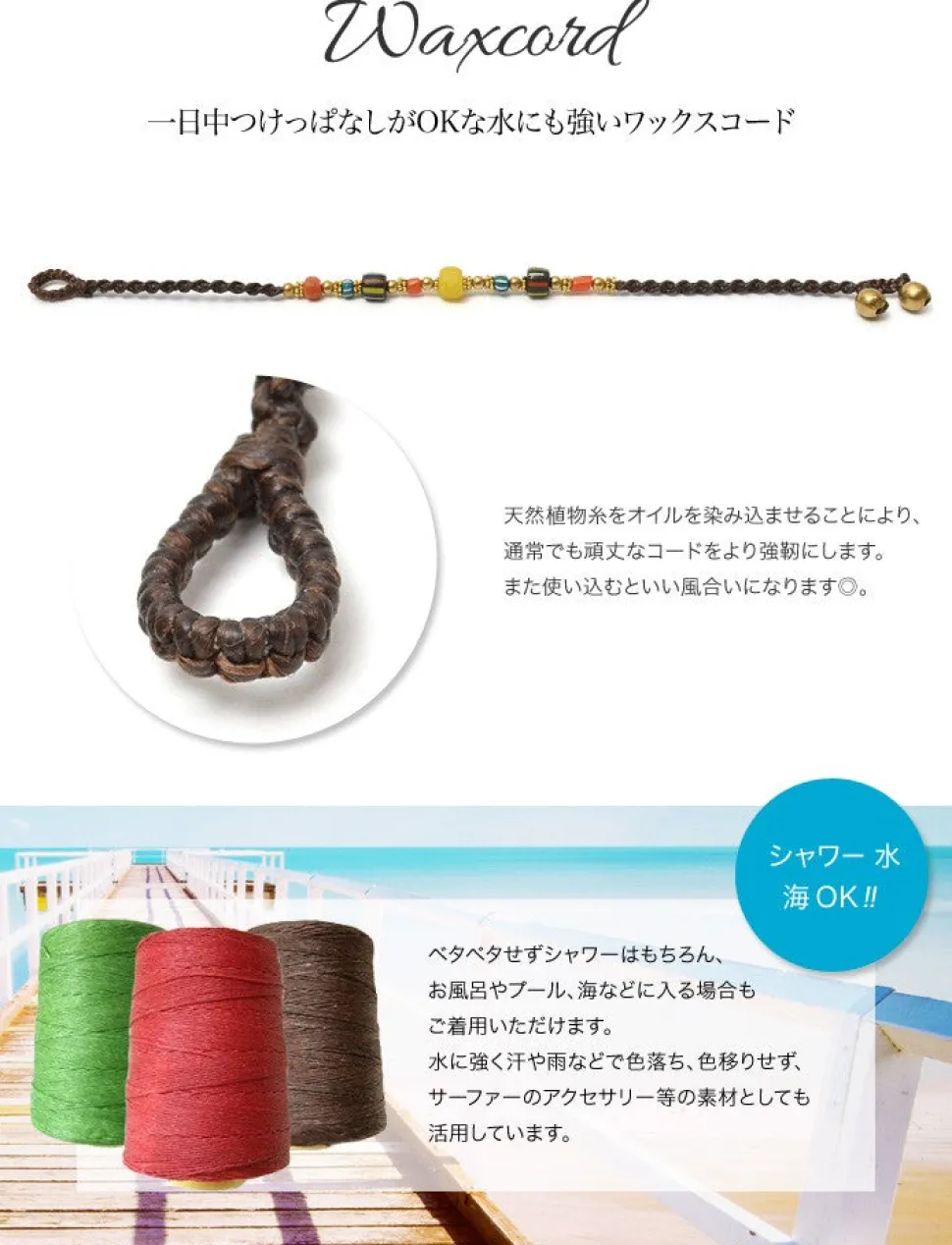| ■ Unique Handmade Beaded Anklet This braided waxed cord anklet is water safe and can be left on all day. The anklet is made with vintage handmade beads for a unique accessory. ■Handmade Vintage Indian Beads We use vintage Indian beads that have a unique colouring and uneven character that is very striking. The colour and size of the glass beads is not stable, but we have tried to keep a certain uniformity by separating them into red multi and blue multi. Waxed cord is tough and water-resistant enough to be left on all day long The natural plant yarn is soaked in oil to make the normally strong cord even tougher. It also gives the cord a nice texture. It is not sticky and can be worn in the shower, in the bath, in the pool or in the sea. The fabric is also water resistant and will not fade or bleed when exposed to sweat or rain, making it an ideal material for surfers’ accessories. Brass accessories are the best match The ball beads between the beads and the clasp are made of brass. The ball bead is made of brass, which will change over time, giving it a nice touch with the wax cord. The two ball beads are not bells, but are there for design purposes and size adjustment. The two ball beads are for design and size adjustment. It is also available in two sizes for unisex use by both men and women. They are also available in two sizes for unisex use. You can also wear them in layers depending on your mood or purpose.