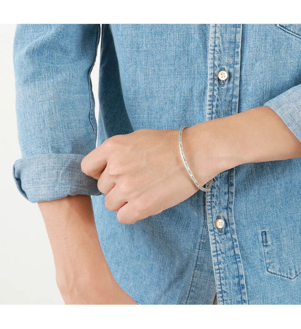 The Karen silver bangle is handcrafted one by one with fine stamp work and a dull shine. Even though there are no fancy decorations, the dull shine of the silver and the warmth that only handmade can give off a great presence. “The stamped geometric pattern and the five circles reflect light like a mirror, which is why it is used as an amulet to repel evil spirits. The triangle means direction and indicates the direction to ward off evil spirits. Karen silver is a little softer than ordinary silver, which makes it possible to do fine work and produce artistic works. What is Karen Silver? Karen Silver is a high-purity silver that is handmade by a small group of mountain tribes in Myanmar and northern Thailand. Each piece is handcrafted one by one and has a different look, a warm texture and a matte shine. This unisex model is suitable for both men and women. It is a perfect item to wear as a pair or as a gift.