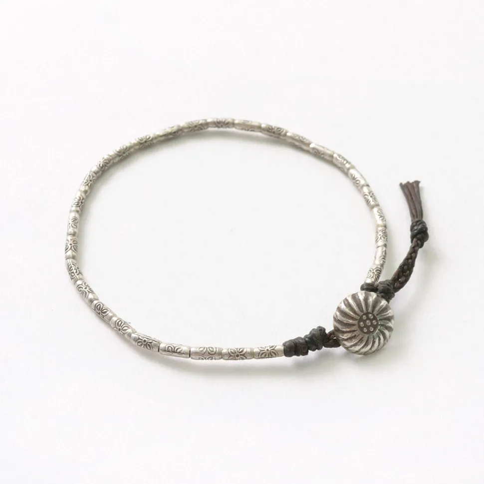 A Karen silver anklet with beautiful patterns inspired by fish and flowers. Handcrafted, each Karen silver bead used in this anklet has a unique expression.