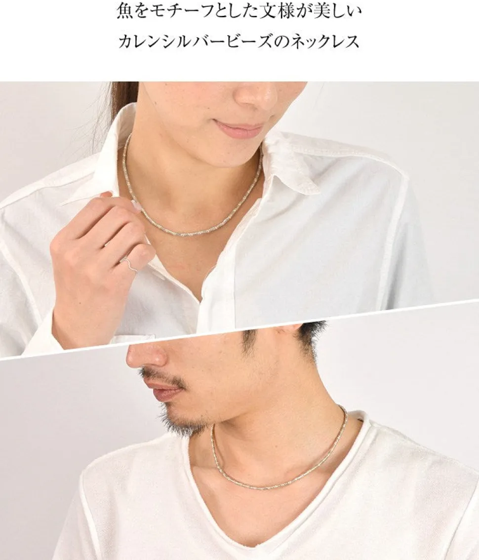 A beautiful Karen silver bead necklace with a motif of fish, each bead has a different expression. The design is simple. Karen silver is a high-purity silver that is handcrafted by a small group of mountain tribes in Myanmar and northern Thailand. The purity of Karen silver is about 95 to 99.9%, compared to 92% for ordinary silver jewelry. The muddy luster and elegance of high-purity silver, as well as the warmth unique to handmade silver, give it a simple yet strong presence. This product is made of cotton cord without wires, so you can wear it all day long. The softness and flexibility of the cotton cord is directly reflected in the overall atmosphere of the product, making it very elegant. Size: 42cm, 45cm, 50cm Country of origin: MADE IN THAILAND Material: Karen Silver