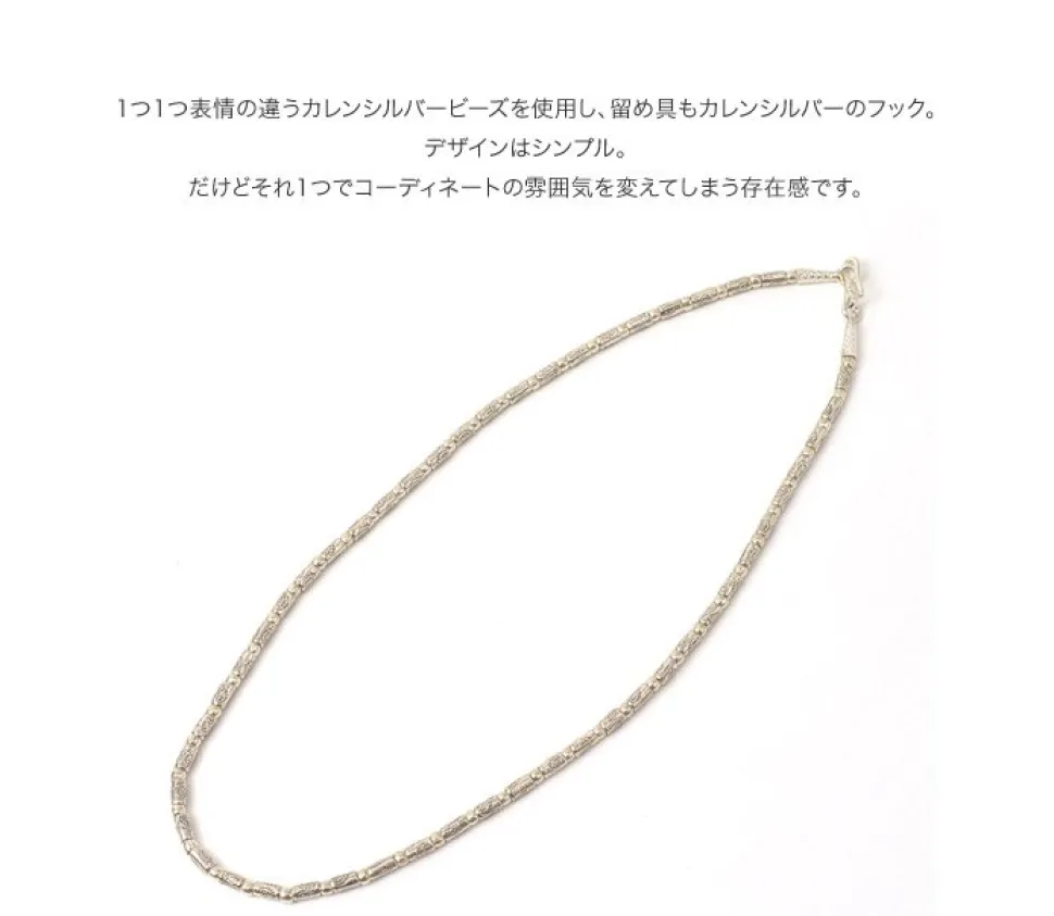 | A beautiful Karen silver bead necklace with a fish motif The Karen silver beads have a different expression each one, and the clasp is also made of Karen silver. Each bead has a different expression and the clasp is also made of Karen silver hooks. The design is simple. The design is simple, but it can change the atmosphere of your outfit with just one piece. The Karen silver is handcrafted by a small group of mountain tribes in Myanmar and northern Thailand. The purity of Karen silver is approximately 95-99.9%, compared to 92% for most silver jewellery. The muddy luster and refinement which only the silver with high purity can give, and the warmth peculiar to the handmade have a sense of existence though it is simple, and it is the silver which is popular in Europe and America. Karen silver comes in a variety of shapes and engravings, and is designed with motifs of plants, animals, fish or household utensils. It is also used as a talisman to protect against evil spirits and as an eye to watch out for misfortune. Karen silver is very different from precisely machined jewellery. Each piece is made by hand and therefore has its own unique look. The warmth and individuality of the Karen silver is another characteristic. Cotton cord without wire This product uses cotton cord without wire, so it can be worn all day long and is easy to handle. The softness and flexibility of the cotton cord is reflected in the overall feel of the product, which is very elegant. No matter how you use it, it will always “fit” naturally.