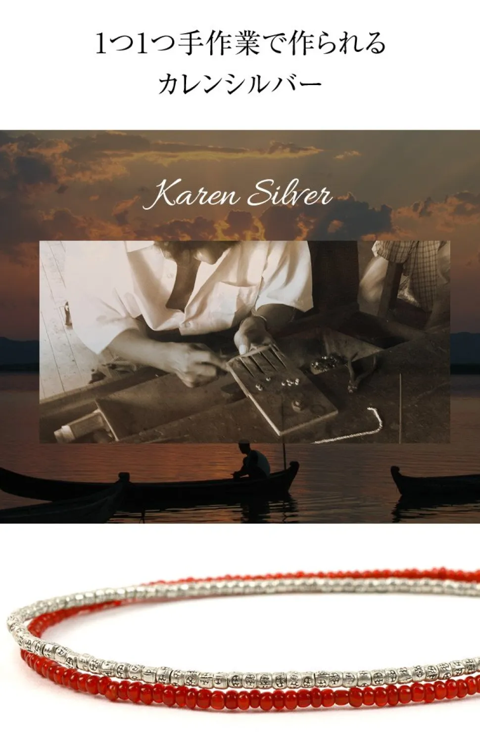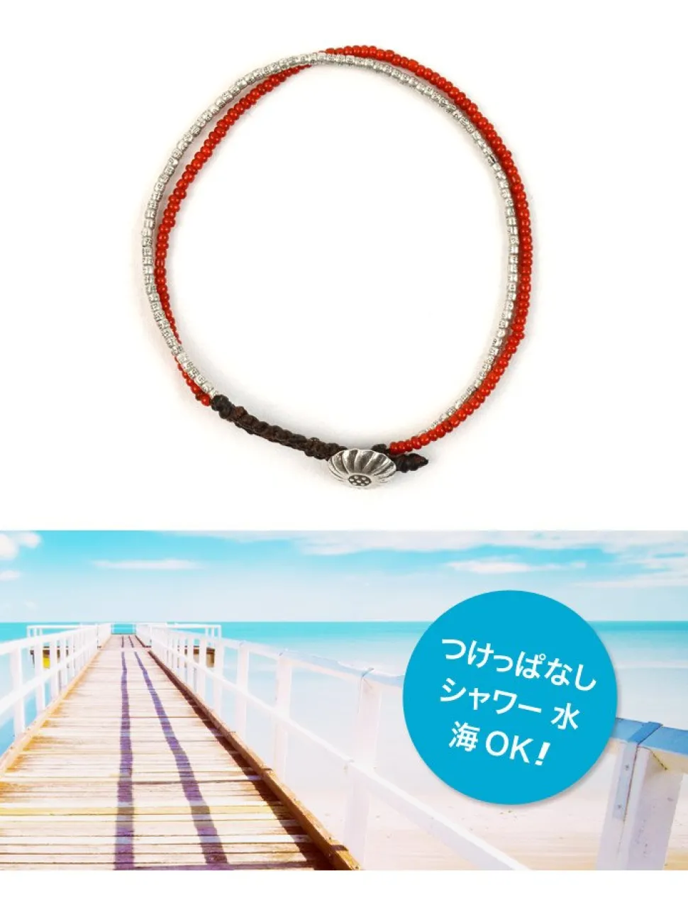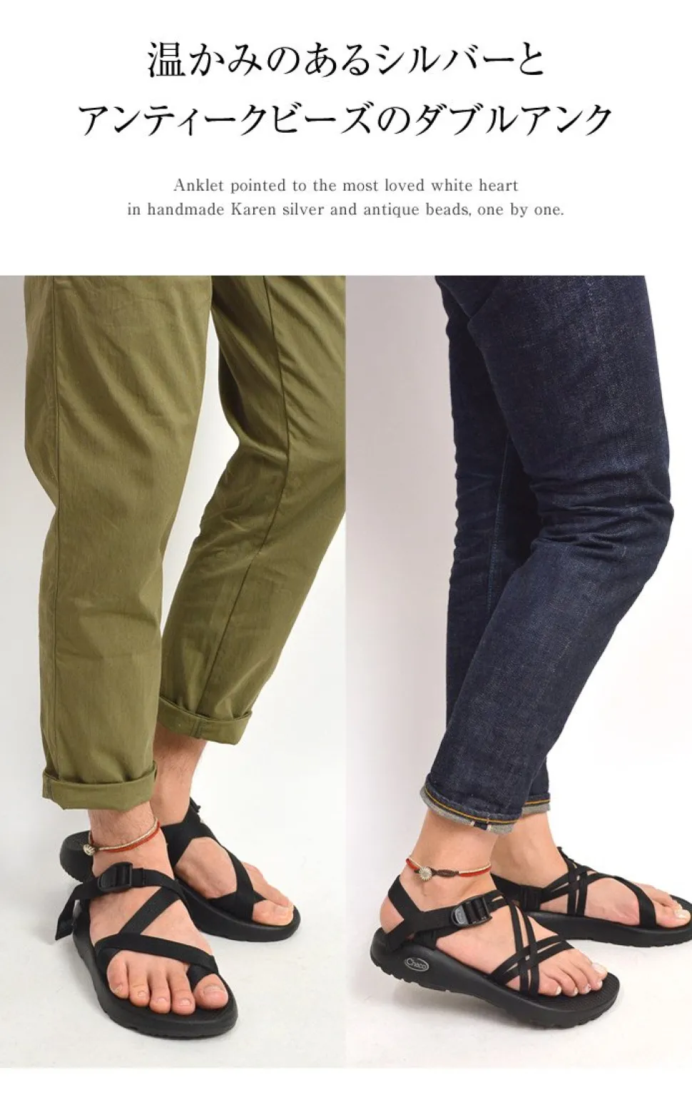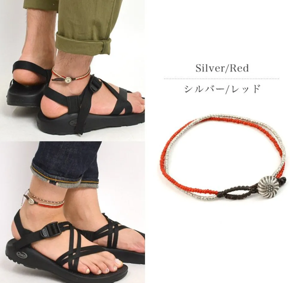 A double anklet of warm silver and antique beads. Each anklet is handmade with unique Karen silver and antique beads, and the most beloved of all, the white heart anklet. Each piece of Karen silver is handcrafted by a small group of mountain tribes in Myanmar and northern Thailand, and is of high purity. Each piece of Karen silver is handcrafted by a small group of people in the mountains of Myanmar and northern Thailand, and has a high purity of 95-99.9%, compared to 92% for most silver jewelry. Strong and water-resistant waxed cordWaxed polyester fibers are soaked in wax and spun to make the normally sturdy cord even tougher. It is not sticky and can be worn in the shower, bath, pool, or ocean. It is also water resistant and will not fade or shift colors due to sweat or rain, and is used as a material for surfers’ accessories.