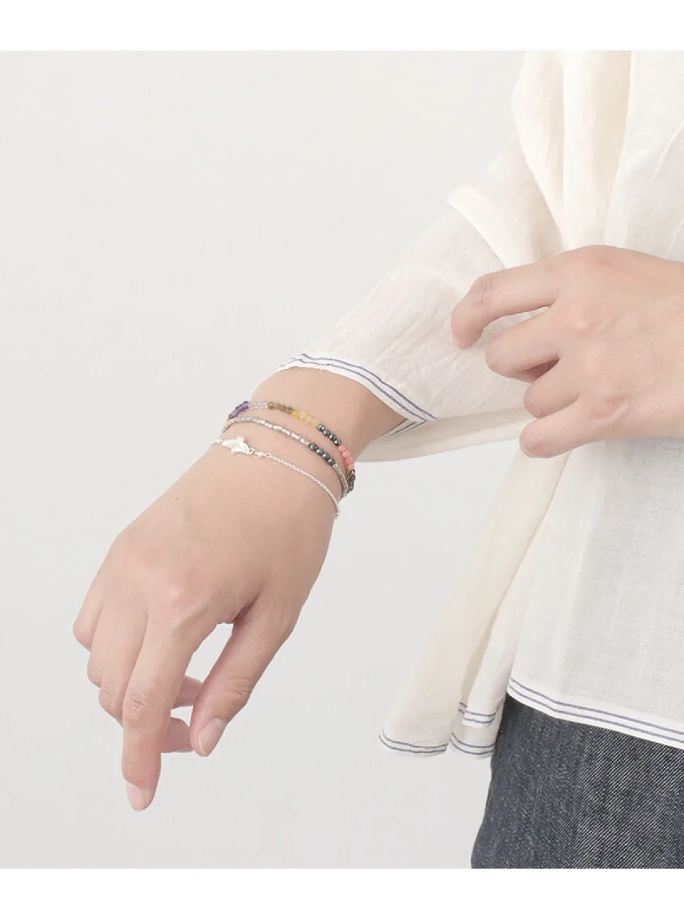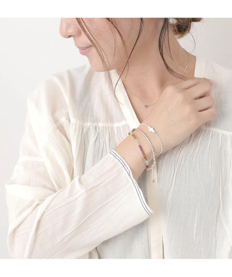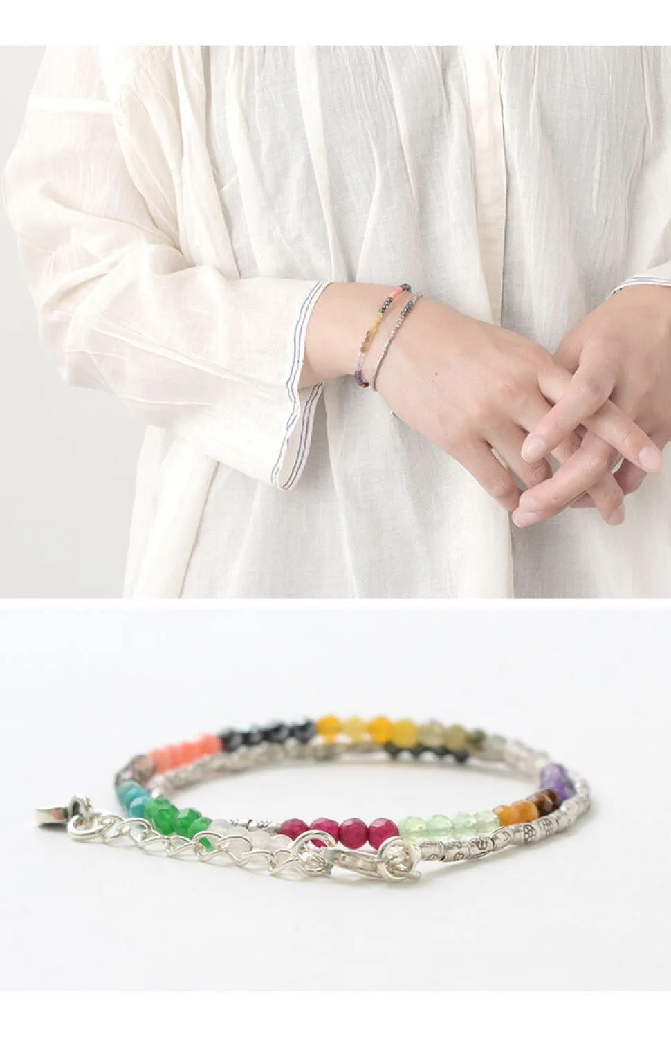 This design combines beads made by cutting natural stones and warm Karen silver. The dull shine of the Karen silver beautifully complements the rich colors of the natural stones. It is slender and simple, yet has an outstanding presence. It is perfect for layering with silver accessories. 13 types of natural stones with a unique presence are processed and used as beads. Each natural stone has a different expression, even if they are of the same type. In addition to their beauty, natural stones are also said to have mystical power to bring about various kinds of luck. Karen silver beads with the Padua pattern engraved on each of the attractive shiny Karen silver beads. The beads are matte, but have a unique luster that shines in an attractive way depending on how the light hits them.