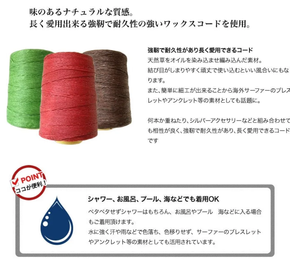 The clasp part is a silver bell. The patterned bell is a nice touch. The design of the bell is specially ordered and arranged by ROCOCO. The natural grass is soaked in oil to make it sturdy and durable, and it also gets a nice texture with use. It is also water resistant and does not fade or change color due to sweat or rain, and is used as a material for surfers’ bracelets and anklets.