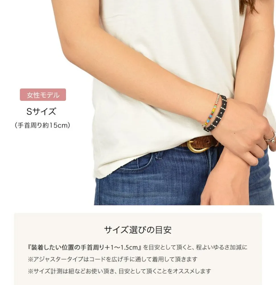 | Wax Cord and Karen Silver Bracelet A tough, water-resistant wax cord that can be worn all day long. Wax Cord and Karen Silver Bracelet Wax Cord and Karen Silver Bracelet Using handcrafted Karen silver The high purity silver is handcrafted by a small group of mountain tribes in Myanmar and Northern Thailand. The purity of Karen silver is approximately 95-99.9%, compared to 92% for most silver jewellery. Simply wear one piece. You can wear it alone or layered to suit your mood or purpose. It can also be worn in layers depending on your mood, purpose or location. They also work well with cords and other beaded accessories. Recommendations for choosing your size Please choose your wrist size, plus approximately 1cm to 1.5cm. It is easy to measure the size of your wrist with a piece of string.