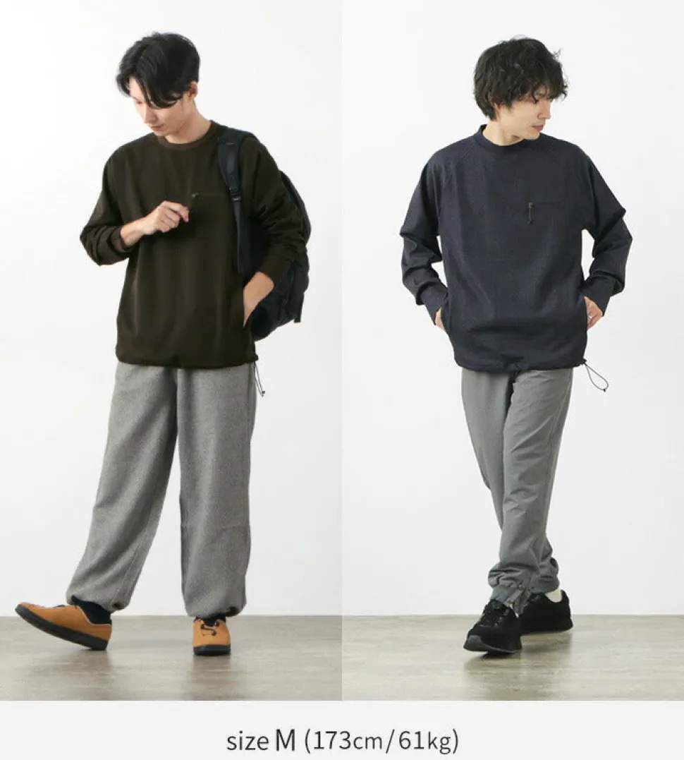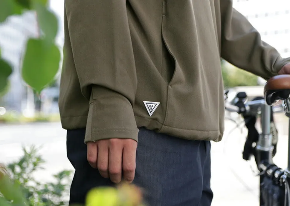 Cotton-based neck with a soft feel and a pocket on the left chest large enough to hold an IC card. The drawcord on the zip pull is a subtle point of interest. Simple, yet roomy pockets on both sides at the waist position. Drawcord at the hem allows you to change the silhouette.